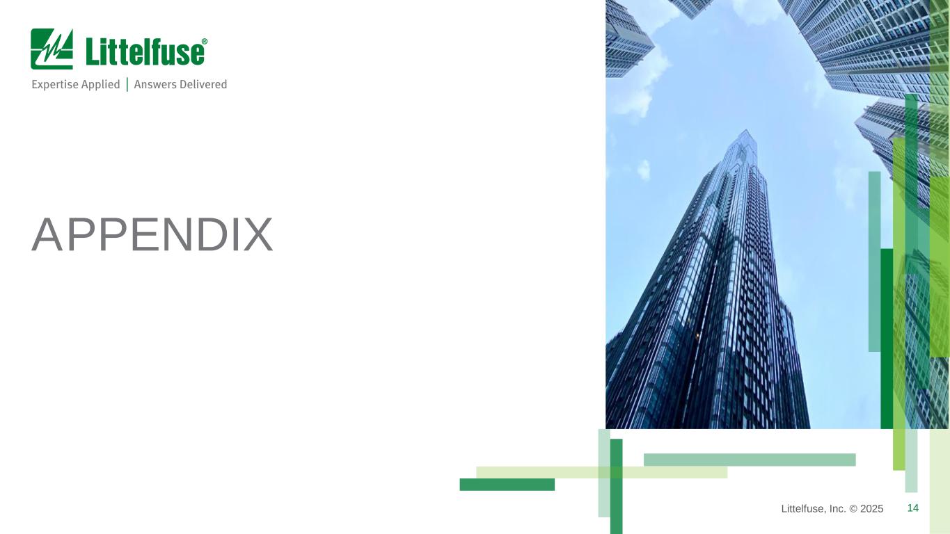 13Littelfuse, Inc. © 2025 FULL YEAR 2025 CONSIDERATIONS / EXPECTATIONS ▪ FY Dortmund capacity sharing agreement impact… +2% growth to Company sales, Neutral EPS impact ▪ F/X & Commodities +1% tailwind to sales; ~+$0.40 benefit to EPS, +60 bps margin benefit at current rates ▪ Other Assumptions – $58m amortization expense – $35m interest expense, expect to offset ~2/3 with interest income from cash investment strategies – Adj. effective tax rate 23-25% ▪ Expect ~100% free cash flow conversion – Projecting ~$90-95m investment in capital expenditures Focused on Executing Through an Uncertain Environment While Not Losing Sight of Strategic Priorities