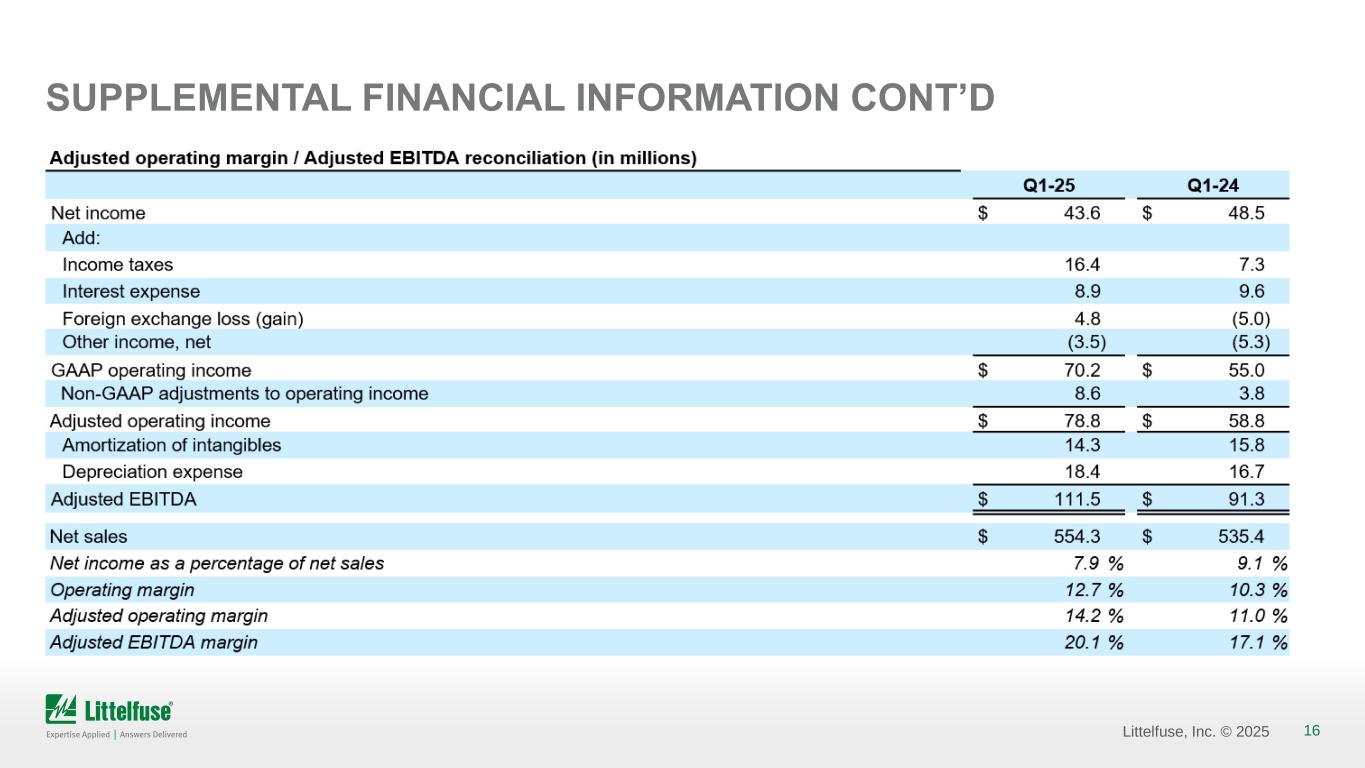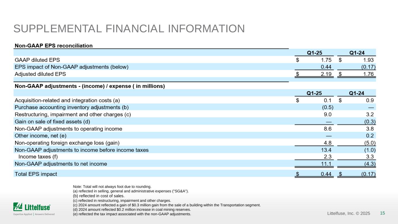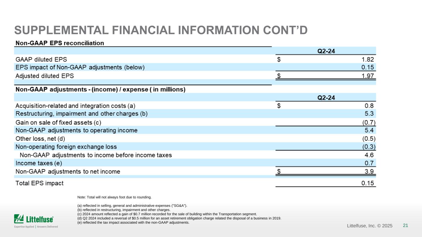 15Littelfuse, Inc. © 2025 SUPPLEMENTAL FINANCIAL INFORMATION Note: Total will not always foot due to rounding. (a) reflected in selling, general and administrative expenses ("SG&A"). (b) reflected in cost of sales. (c) reflected in restructuring, impairment and other charges. (c) 2024 amount reflected a gain of $0.3 million gain from the sale of a building within the Transportation segment. (d) 2024 amount reflected $0.2 million increase in coal mining reserves. (e) reflected the tax impact associated with the non-GAAP adjustments.