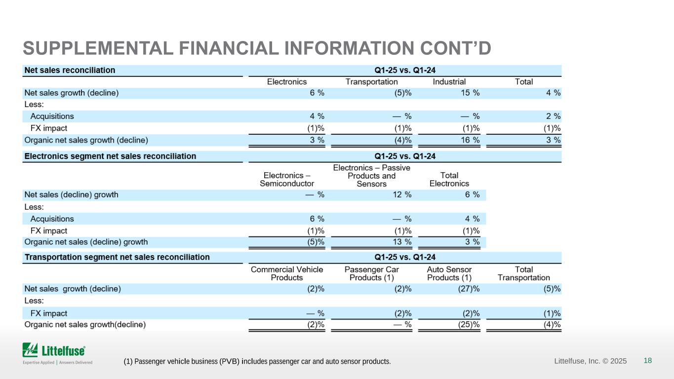 17Littelfuse, Inc. © 2025 SUPPLEMENTAL FINANCIAL INFORMATION CONT’D