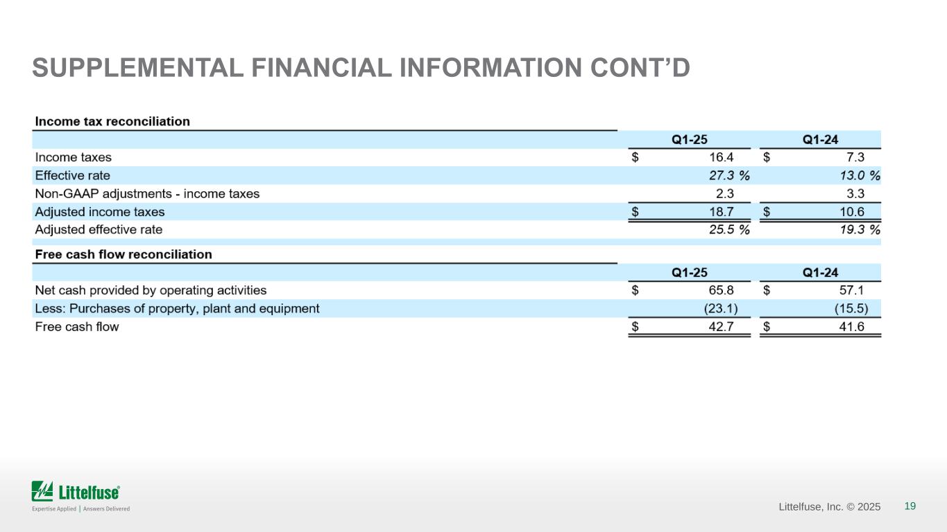 18Littelfuse, Inc. © 2025 SUPPLEMENTAL FINANCIAL INFORMATION CONT’D (1) Passenger vehicle business (PVB) includes passenger car and auto sensor products.