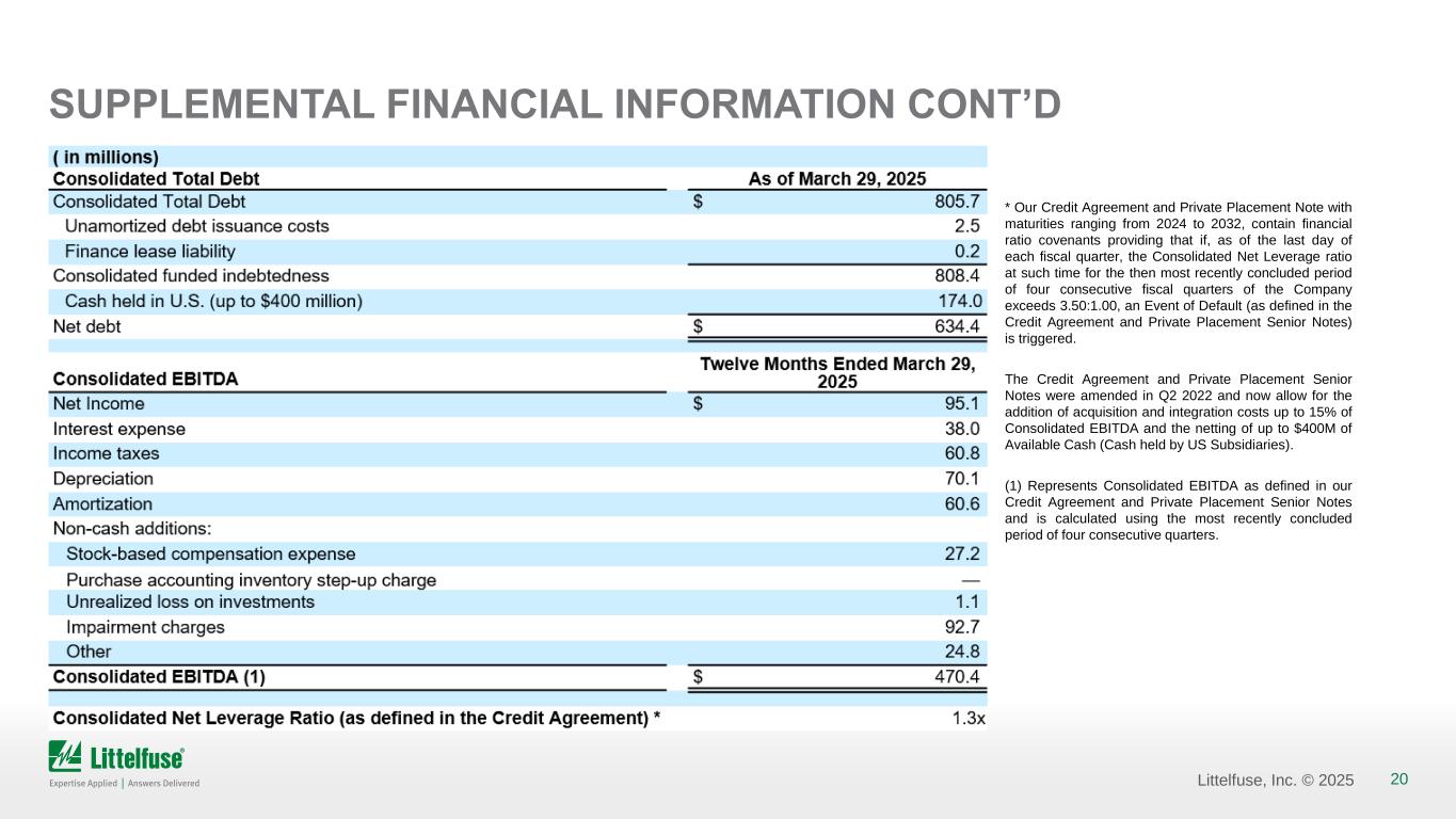 19Littelfuse, Inc. © 2025 SUPPLEMENTAL FINANCIAL INFORMATION CONT’D