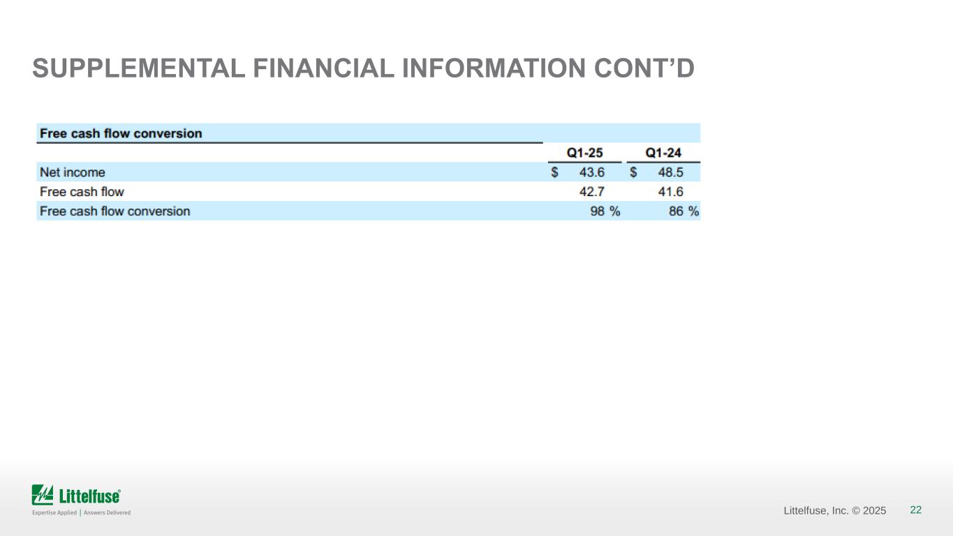22Littelfuse, Inc. © 2025 SUPPLEMENTAL FINANCIAL INFORMATION CONT’D