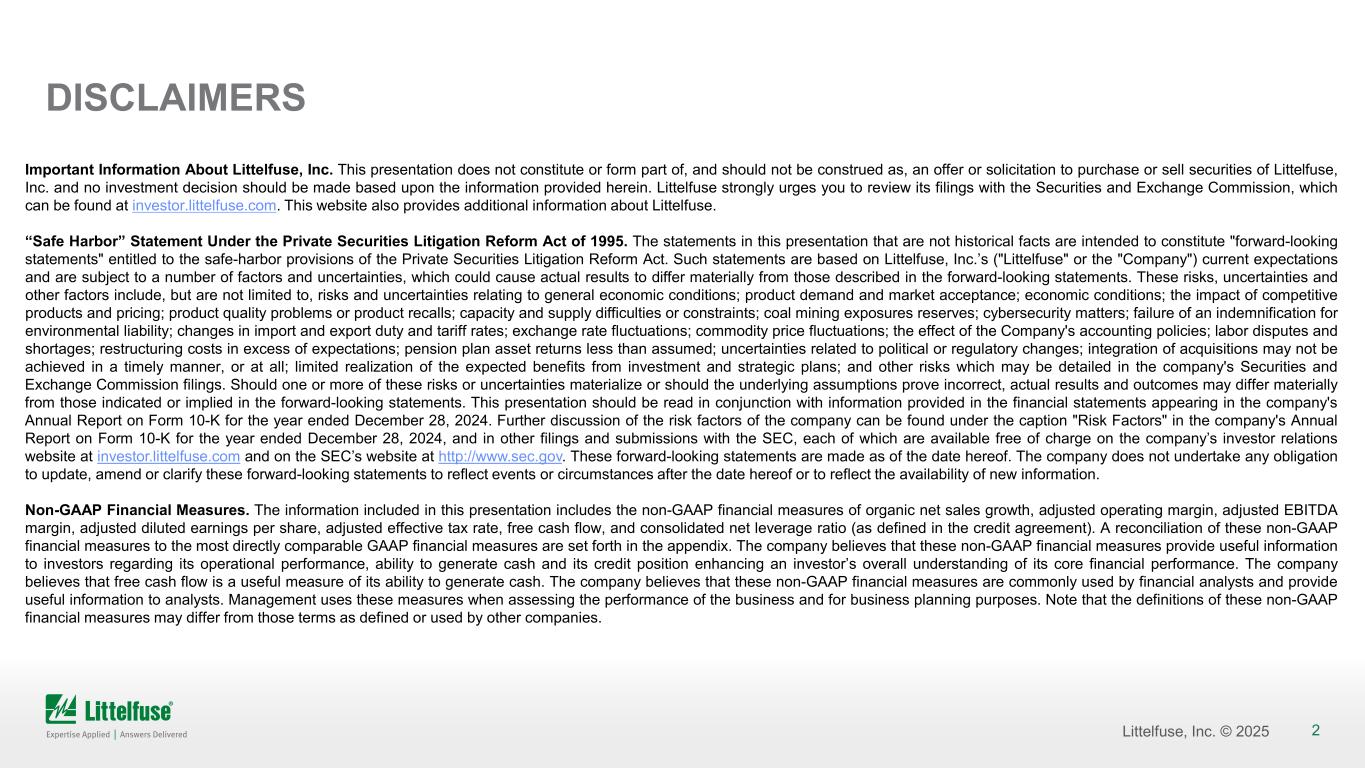 2Littelfuse, Inc. © 2025 DISCLAIMERS Important Information About Littelfuse, Inc. This presentation does not constitute or form part of, and should not be construed as, an offer or solicitation to purchase or sell securities of Littelfuse, Inc. and no investment decision should be made based upon the information provided herein. Littelfuse strongly urges you to review its filings with the Securities and Exchange Commission, which can be found at investor.littelfuse.com. This website also provides additional information about Littelfuse. “Safe Harbor” Statement Under the Private Securities Litigation Reform Act of 1995. The statements in this presentation that are not historical facts are intended to constitute "forward-looking statements" entitled to the safe-harbor provisions of the Private Securities Litigation Reform Act. Such statements are based on Littelfuse, Inc.’s ("Littelfuse" or the "Company") current expectations and are subject to a number of factors and uncertainties, which could cause actual results to differ materially from those described in the forward-looking statements. These risks, uncertainties and other factors include, but are not limited to, risks and uncertainties relating to general economic conditions; product demand and market acceptance; economic conditions; the impact of competitive products and pricing; product quality problems or product recalls; capacity and supply difficulties or constraints; coal mining exposures reserves; cybersecurity matters; failure of an indemnification for environmental liability; changes in import and export duty and tariff rates; exchange rate fluctuations; commodity price fluctuations; the effect of the Company's accounting policies; labor disputes and shortages; restructuring costs in excess of expectations; pension plan asset returns less than assumed; uncertainties related to political or regulatory changes; integration of acquisitions may not be achieved in a timely manner, or at all; limited realization of the expected benefits from investment and strategic plans; and other risks which may be detailed in the company's Securities and Exchange Commission filings. Should one or more of these risks or uncertainties materialize or should the underlying assumptions prove incorrect, actual results and outcomes may differ materially from those indicated or implied in the forward-looking statements. This presentation should be read in conjunction with information provided in the financial statements appearing in the company's Annual Report on Form 10-K for the year ended December 28, 2024. Further discussion of the risk factors of the company can be found under the caption "Risk Factors" in the company's Annual Report on Form 10-K for the year ended December 28, 2024, and in other filings and submissions with the SEC, each of which are available free of charge on the company’s investor relations website at investor.littelfuse.com and on the SEC’s website at http://www.sec.gov. These forward-looking statements are made as of the date hereof. The company does not undertake any obligation to update, amend or clarify these forward-looking statements to reflect events or circumstances after the date hereof or to reflect the availability of new information. Non-GAAP Financial Measures. The information included in this presentation includes the non-GAAP financial measures of organic net sales growth, adjusted operating margin, adjusted EBITDA margin, adjusted diluted earnings per share, adjusted effective tax rate, free cash flow, and consolidated net leverage ratio (as defined in the credit agreement). A reconciliation of these non-GAAP financial measures to the most directly comparable GAAP financial measures are set forth in the appendix. The company believes that these non-GAAP financial measures provide useful information to investors regarding its operational performance, ability to generate cash and its credit position enhancing an investor’s overall understanding of its core financial performance. The company believes that free cash flow is a useful measure of its ability to generate cash. The company believes that these non-GAAP financial measures are commonly used by financial analysts and provide useful information to analysts. Management uses these measures when assessing the performance of the business and for business planning purposes. Note that the definitions of these non-GAAP financial measures may differ from those terms as defined or used by other companies.