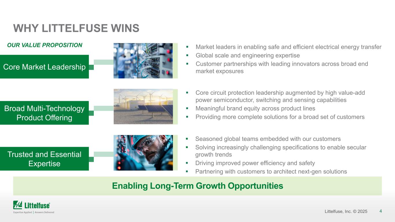3Littelfuse, Inc. © 2025 STRATEGIC PRIORITIES Enhance our Focus to Capitalize on Future Growth Opportunities Provide More Complete Solutions for a Broader Set of Customers Drive Further Operational Excellence to Amplify Long-Term Performance  More structured evaluation of secular growth opportunities  Better leverage teams & technology leadership  Expand higher voltage & energy density application opportunities  More collaborative approach across businesses  Further align technology capabilities and sales structure  Enhance customer support for next gen product development  Better leverage operating practices across businesses  Further optimize operating structure for scale  Enhance long-term profitability 01 02 03