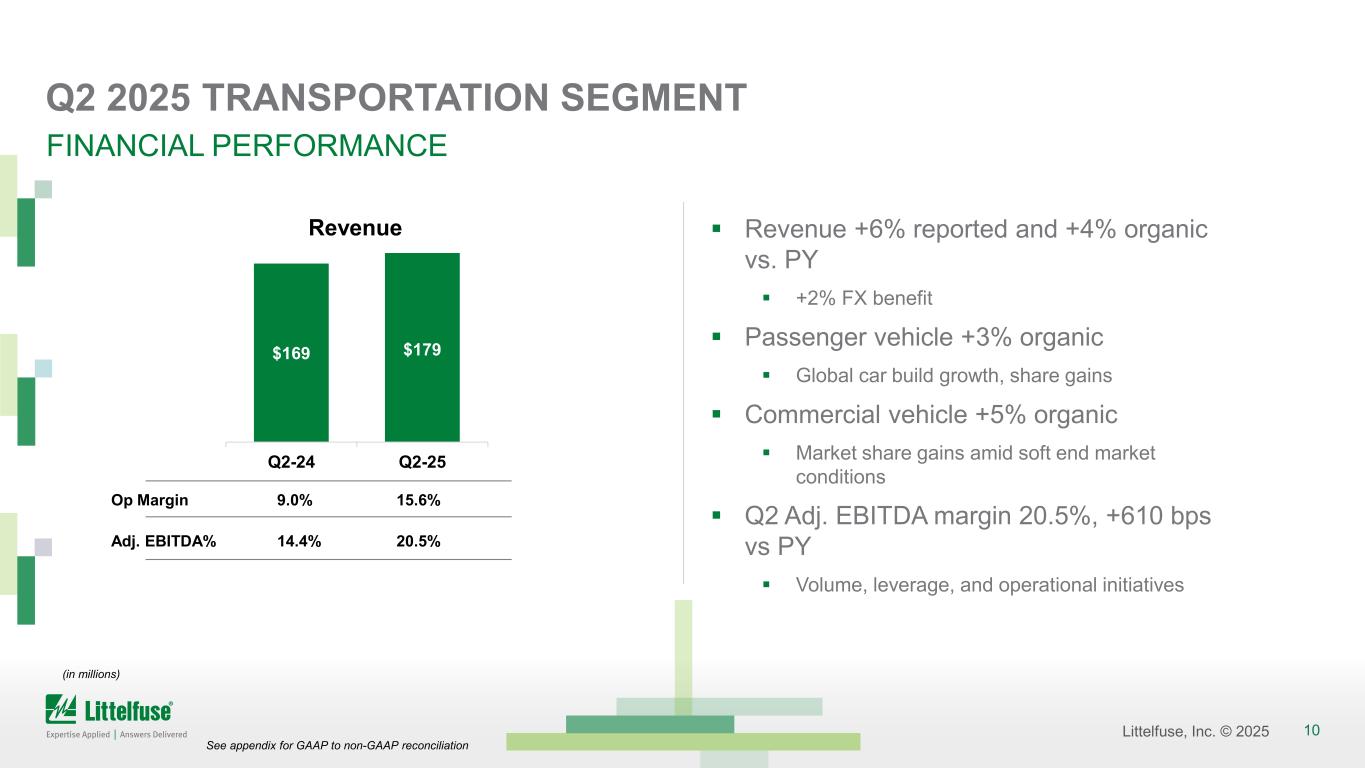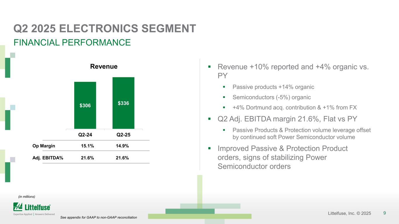 9Littelfuse, Inc. © 2025 Q2 2025 ELECTRONICS SEGMENT  Revenue +10% reported and +4% organic vs. PY  Passive products +14% organic  Semiconductors (-5%) organic  +4% Dortmund acq. contribution & +1% from FX  Q2 Adj. EBITDA margin 21.6%, Flat vs PY  Passive Products & Protection volume leverage offset by continued soft Power Semiconductor volume  Improved Passive & Protection Product orders, signs of stabilizing Power Semiconductor orders FINANCIAL PERFORMANCE Op Margin 15.1% 14.9% Adj. EBITDA% 21.6% 21.6% $306 $336 Q2-24 Q2-25 Revenue (in millions) See appendix for GAAP to non-GAAP reconciliation