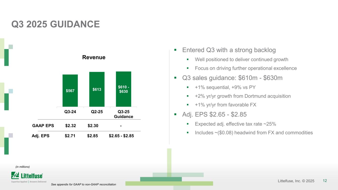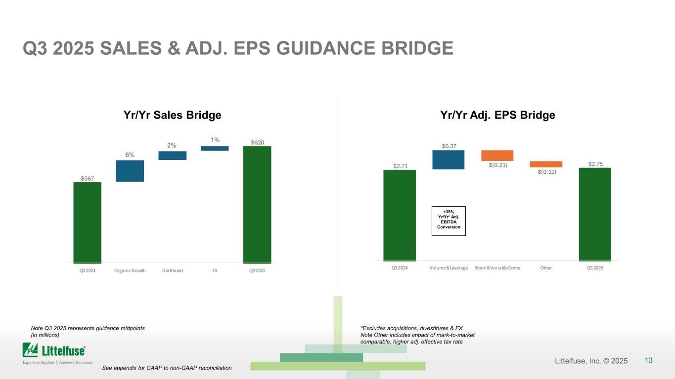 12Littelfuse, Inc. © 2025 Q3 2025 GUIDANCE  Entered Q3 with a strong backlog  Well positioned to deliver continued growth  Focus on driving further operational excellence  Q3 sales guidance: $610m - $630m  +1% sequential, +9% vs PY  +2% yr/yr growth from Dortmund acquisition  +1% yr/yr from favorable FX  Adj. EPS $2.65 - $2.85  Expected adj. effective tax rate ~25%  Includes ~($0.08) headwind from FX and commodities (in millions) $567 $613 $610 - $630 Q3-24 Q2-25 Q3-25 Guidance Revenue Adj. EPS $2.71 $2.85 $2.65 - $2.85 GAAP EPS $2.32 $2.30 - See appendix for GAAP to non-GAAP reconciliation