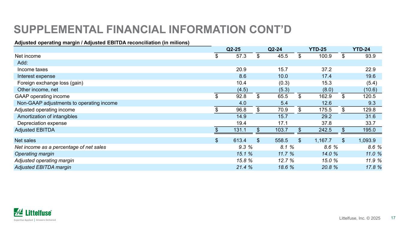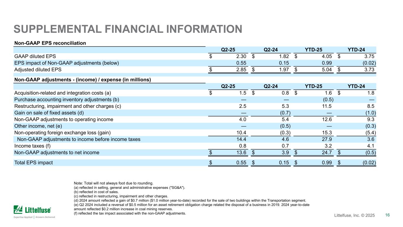 16Littelfuse, Inc. © 2025 16Littelfuse, Inc. © 2025 SUPPLEMENTAL FINANCIAL INFORMATION Note: Total will not always foot due to rounding. (a) reflected in selling, general and administrative expenses ("SG&A"). (b) reflected in cost of sales. (c) reflected in restructuring, impairment and other charges. (d) 2024 amount reflected a gain of $0.7 million ($1.0 million year-to-date) recorded for the sale of two buildings within the Transportation segment. (e) Q2 2024 included a reversal of $0.5 million for an asset retirement obligation charge related the disposal of a business in 2019. 2024 year-to-date amount reflected $0.2 million increase in coal mining reserves. (f) reflected the tax impact associated with the non-GAAP adjustments. Non-GAAP EPS reconciliation Q2-25 Q2-24 YTD-25 YTD-24 GAAP diluted EPS $ 2.30 $ 1.82 $ 4.05 $ 3.75 EPS impact of Non-GAAP adjustments (below) 0.55 0.15 0.99 (0.02) Adjusted diluted EPS $ 2.85 $ 1.97 $ 5.04 $ 3.73 Non-GAAP adjustments - (income) / expense (in millions) Q2-25 Q2-24 YTD-25 YTD-24 Acquisition-related and integration costs (a) $ 1.5 $ 0.8 $ 1.6 $ 1.8 Purchase accounting inventory adjustments (b) — — (0.5) — Restructuring, impairment and other charges (c) 2.5 5.3 11.5 8.5 Gain on sale of fixed assets (d) — (0.7) — (1.0) Non-GAAP adjustments to operating income 4.0 5.4 12.6 9.3 Other income, net (e) — (0.5) — (0.3) Non-operating foreign exchange loss (gain) 10.4 (0.3) 15.3 (5.4) Non-GAAP adjustments to income before income taxes 14.4 4.6 27.9 3.6 Income taxes (f) 0.8 0.7 3.2 4.1 Non-GAAP adjustments to net income $ 13.6 $ 3.9 $ 24.7 $ (0.5) Total EPS impact $ 0.55 $ 0.15 $ 0.99 $ (0.02)