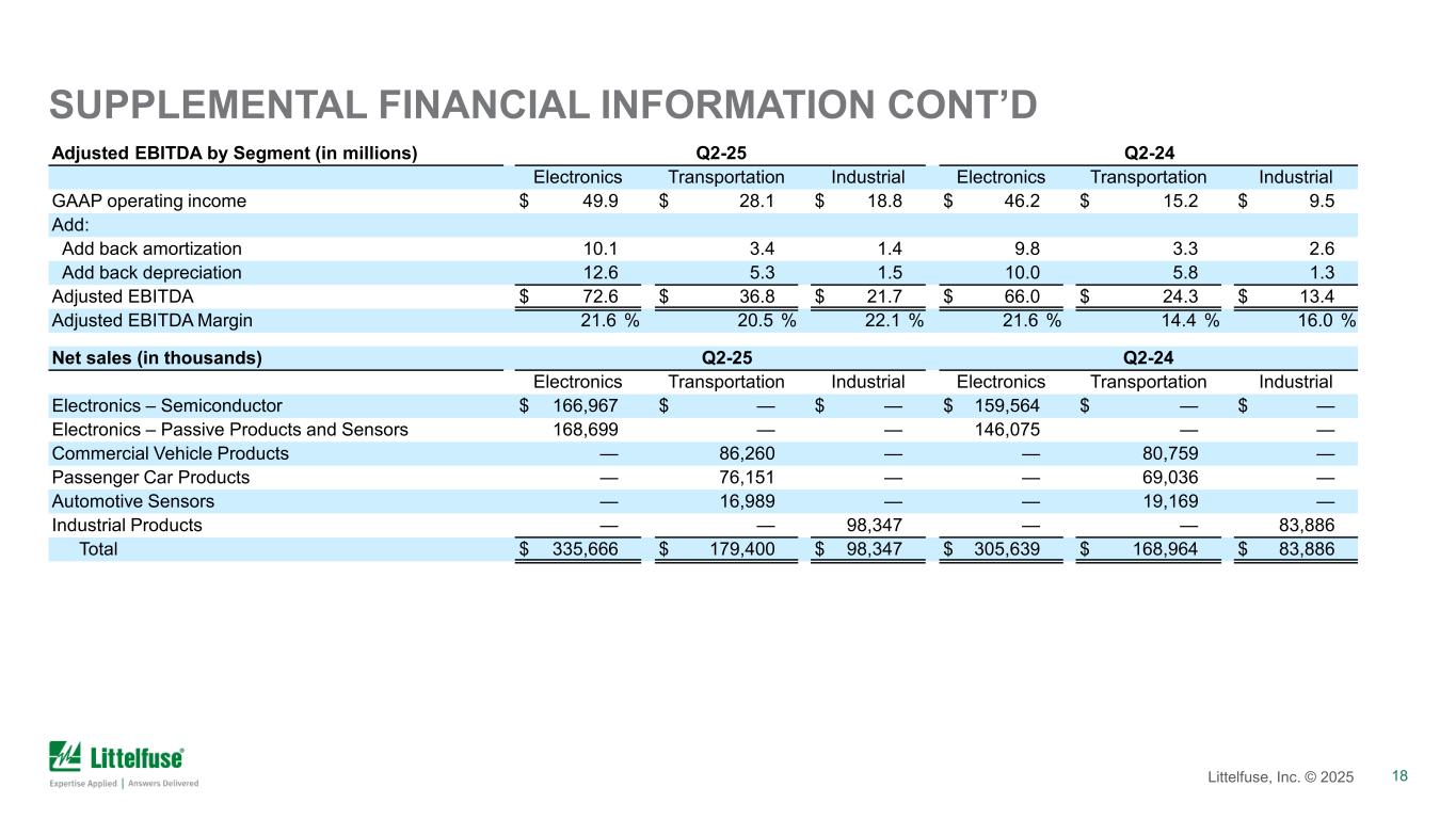 17Littelfuse, Inc. © 2025 17Littelfuse, Inc. © 2025 SUPPLEMENTAL FINANCIAL INFORMATION CONT’D Adjusted operating margin / Adjusted EBITDA reconciliation (in milions) Q2-25 Q2-24 YTD-25 YTD-24 Net income $ 57.3 $ 45.5 $ 100.9 $ 93.9 Add: Income taxes 20.9 15.7 37.2 22.9 Interest expense 8.6 10.0 17.4 19.6 Foreign exchange loss (gain) 10.4 (0.3) 15.3 (5.4) Other income, net (4.5) (5.3) (8.0) (10.6) GAAP operating income $ 92.8 $ 65.5 $ 162.9 $ 120.5 Non-GAAP adjustments to operating income 4.0 5.4 12.6 9.3 Adjusted operating income $ 96.8 $ 70.9 $ 175.5 $ 129.8 Amortization of intangibles 14.9 15.7 29.2 31.6 Depreciation expense 19.4 17.1 37.8 33.7 Adjusted EBITDA $ 131.1 $ 103.7 $ 242.5 $ 195.0 Net sales $ 613.4 $ 558.5 $ 1,167.7 $ 1,093.9 Net income as a percentage of net sales 9.3 % 8.1 % 8.6 % 8.6 % Operating margin 15.1 % 11.7 % 14.0 % 11.0 % Adjusted operating margin 15.8 % 12.7 % 15.0 % 11.9 % Adjusted EBITDA margin 21.4 % 18.6 % 20.8 % 17.8 %