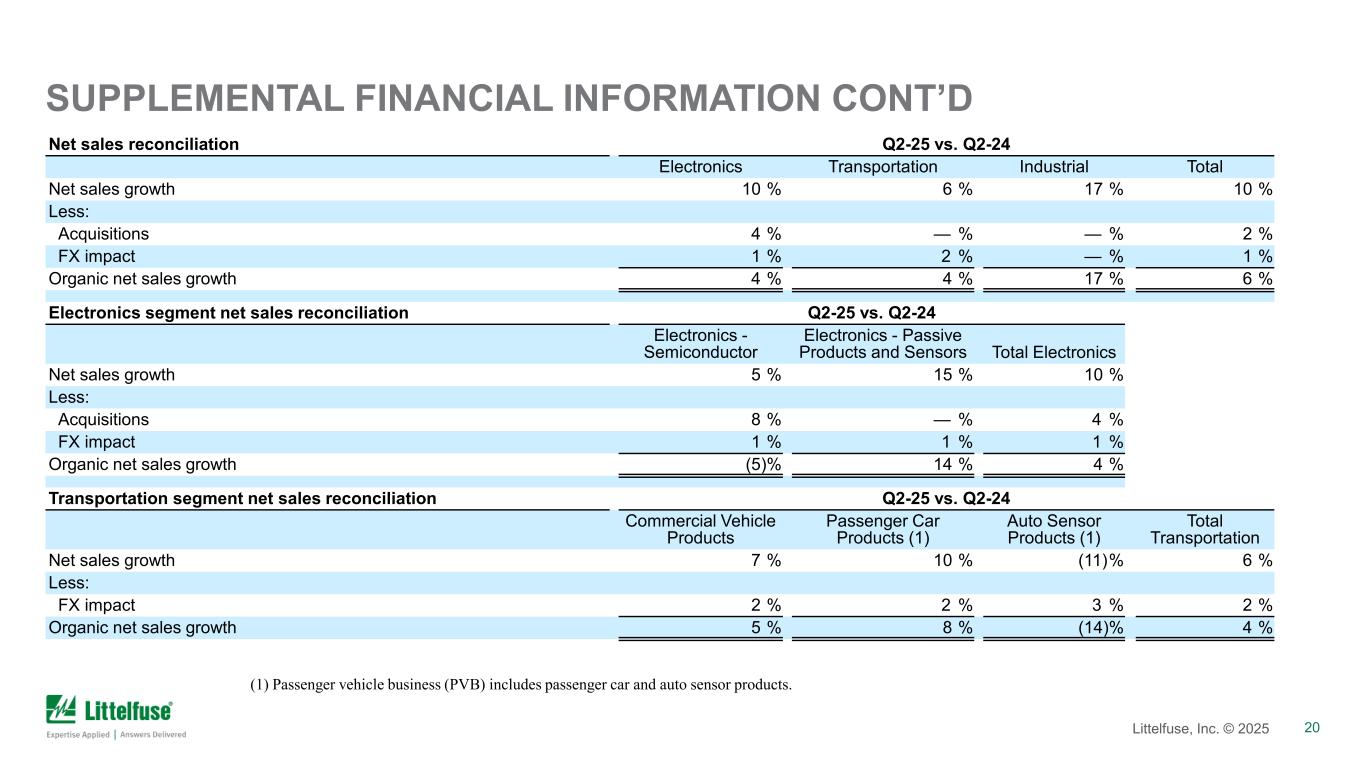 19Littelfuse, Inc. © 2025 19Littelfuse, Inc. © 2025 SUPPLEMENTAL FINANCIAL INFORMATION CONT’D Adjusted EBITDA by Segment (in millions) YTD-25 YTD-24 Electronics Transportation Industrial Electronics Transportation Industrial GAAP operating income $ 96.6 $ 47.0 $ 31.9 $ 84.0 $ 31.4 $ 14.3 Add: Add back amortization 19.9 6.8 2.5 19.7 6.8 5.1 Add back depreciation 24.0 10.8 3.0 19.9 11.0 2.8 Adjusted EBITDA $ 140.5 $ 64.6 $ 37.4 $ 123.6 $ 49.2 $ 22.2 Adjusted EBITDA Margin 21.8 % 18.9 % 20.4 % 20.7 % 14.5 % 14.1 % Net sales (in thousands) YTD-25 YTD-24 Electronics Transportation Industrial Electronics Transportation Industrial Electronics – Semiconductor $ 325,256 $ — $ — $ 317,435 $ — $ — Electronics – Passive Products and Sensors 317,659 — — 279,309 — — Commercial Vehicle Products — 164,029 — — 160,273 — Passenger Car Products — 145,186 — — 139,298 — Automotive Sensors — 32,047 — — 39,760 — Industrial Products — — 183,543 157,799 Total $ 642,915 $ 341,262 $ 183,543 $ 596,744 $ 339,331 $ 157,799