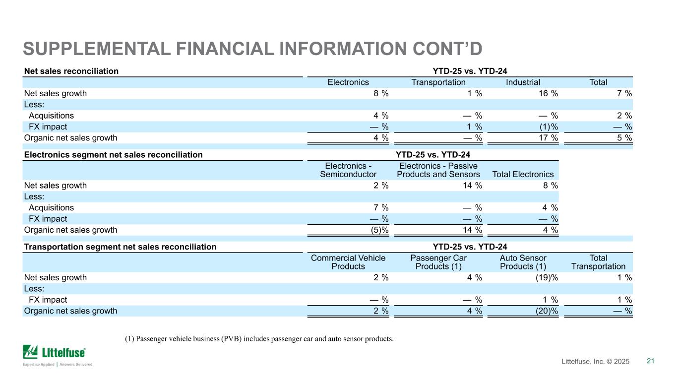 20Littelfuse, Inc. © 2025 20Littelfuse, Inc. © 2025 SUPPLEMENTAL FINANCIAL INFORMATION CONT’D (1) Passenger vehicle business (PVB) includes passenger car and auto sensor products. Net sales reconciliation Q2-25 vs. Q2-24 Electronics Transportation Industrial Total Net sales growth 10 % 6 % 17 % 10 % Less: Acquisitions 4 % — % — % 2 % FX impact 1 % 2 % — % 1 % Organic net sales growth 4 % 4 % 17 % 6 % Electronics segment net sales reconciliation Q2-25 vs. Q2-24 Electronics - Semiconductor Electronics - Passive Products and Sensors Total Electronics Net sales growth 5 % 15 % 10 % Less: Acquisitions 8 % — % 4 % FX impact 1 % 1 % 1 % Organic net sales growth (5)% 14 % 4 % Transportation segment net sales reconciliation Q2-25 vs. Q2-24 Commercial Vehicle Products Passenger Car Products (1) Auto Sensor Products (1) Total Transportation Net sales growth 7 % 10 % (11)% 6 % Less: FX impact 2 % 2 % 3 % 2 % Organic net sales growth 5 % 8 % (14)% 4 %