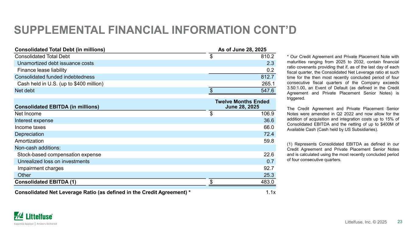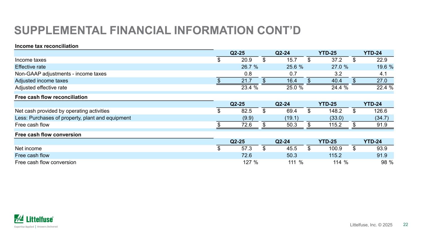 22Littelfuse, Inc. © 2025 22Littelfuse, Inc. © 2025 SUPPLEMENTAL FINANCIAL INFORMATION CONT’D Income tax reconciliation Q2-25 Q2-24 YTD-25 YTD-24 Income taxes $ 20.9 $ 15.7 $ 37.2 $ 22.9 Effective rate 26.7 % 25.6 % 27.0 % 19.6 % Non-GAAP adjustments - income taxes 0.8 0.7 3.2 4.1 Adjusted income taxes $ 21.7 $ 16.4 $ 40.4 $ 27.0 Adjusted effective rate 23.4 % 25.0 % 24.4 % 22.4 % Free cash flow reconciliation Q2-25 Q2-24 YTD-25 YTD-24 Net cash provided by operating activities $ 82.5 $ 69.4 $ 148.2 $ 126.6 Less: Purchases of property, plant and equipment (9.9) (19.1) (33.0) (34.7) Free cash flow $ 72.6 $ 50.3 $ 115.2 $ 91.9 Free cash flow conversion Q2-25 Q2-24 YTD-25 YTD-24 Net income $ 57.3 $ 45.5 $ 100.9 $ 93.9 Free cash flow 72.6 50.3 115.2 91.9 Free cash flow conversion 127 % 111 % 114 % 98 %