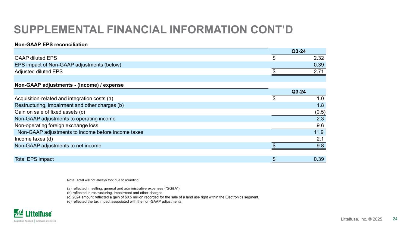 24Littelfuse, Inc. © 2025 24Littelfuse, Inc. © 2025 SUPPLEMENTAL FINANCIAL INFORMATION CONT’D Note: Total will not always foot due to rounding. (a) reflected in selling, general and administrative expenses ("SG&A"). (b) reflected in restructuring, impairment and other charges. (c) 2024 amount reflected a gain of $0.5 million recorded for the sale of a land use right within the Electronics segment. (d) reflected the tax impact associated with the non-GAAP adjustments. Non-GAAP EPS reconciliation Q3-24 GAAP diluted EPS $ 2.32 EPS impact of Non-GAAP adjustments (below) 0.39 Adjusted diluted EPS $ 2.71 Non-GAAP adjustments - (income) / expense Q3-24 Acquisition-related and integration costs (a) $ 1.0 Restructuring, impairment and other charges (b) 1.8 Gain on sale of fixed assets (c) (0.5) Non-GAAP adjustments to operating income 2.3 Non-operating foreign exchange loss 9.6 Non-GAAP adjustments to income before income taxes 11.9 Income taxes (d) 2.1 Non-GAAP adjustments to net income $ 9.8 Total EPS impact $ 0.39