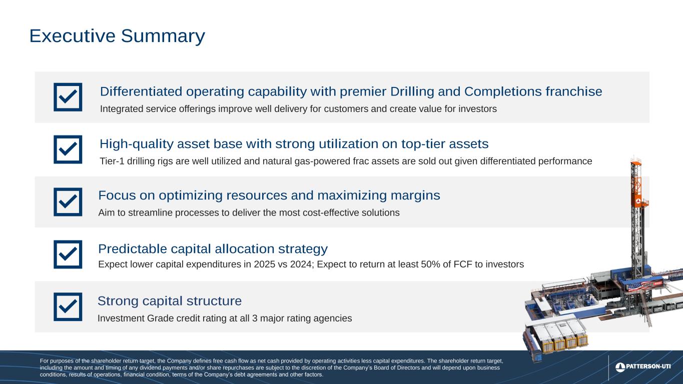 3 Differentiated operating capability with premier Drilling and Completions franchise Integrated service offerings improve well delivery for customers and create value for investors Predictable capital allocation strategy Expect lower capital expenditures in 2025 vs 2024; Expect to return at least 50% of FCF to investors Focus on optimizing resources and maximizing margins Aim to streamline processes to deliver the most cost-effective solutions Strong capital structure Investment Grade credit rating at all 3 major rating agencies Executive Summary High-quality asset base with strong utilization on top-tier assets Tier-1 drilling rigs are well utilized and natural gas-powered frac assets are sold out given differentiated performance For purposes of the shareholder return target, the Company defines free cash flow as net cash provided by operating activities less capital expenditures. The shareholder return target, including the amount and timing of any dividend payments and/or share repurchases are subject to the discretion of the Company’s Board of Directors and will depend upon business conditions, results of operations, financial condition, terms of the Company’s debt agreements and other factors.