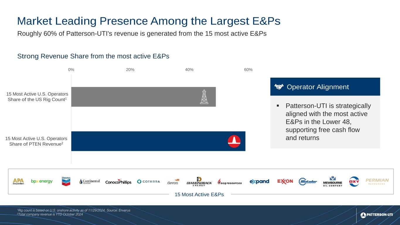 6 Market Leading Presence Among the Largest E&Ps Roughly 60% of Patterson-UTI's revenue is generated from the 15 most active E&Ps 1Rig count is based on U.S. onshore activity as of 11/29/2024. Source: Enverus 2Total company revenue is YTD October 2024 15 Most Active E&Ps Strong Revenue Share from the most active E&Ps 0% 20% 40% 60% 15 Most Active U.S. Operators Share of the US Rig Count1 15 Most Active U.S. Operators Share of PTEN Revenue2 ▪ Patterson-UTI is strategically aligned with the most active E&Ps in the Lower 48, supporting free cash flow and returns Operator Alignment