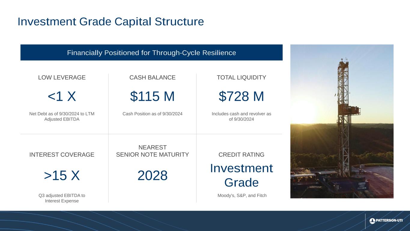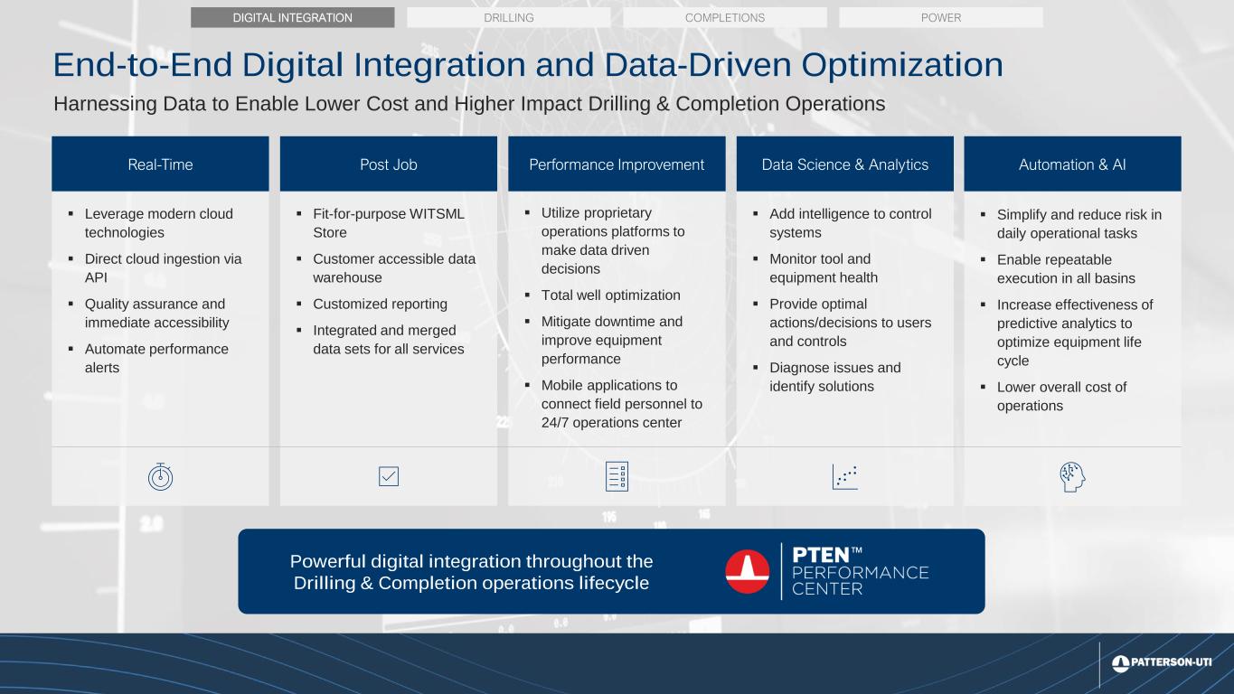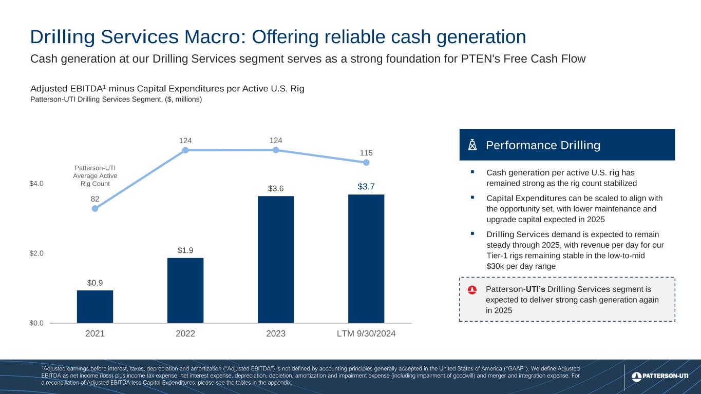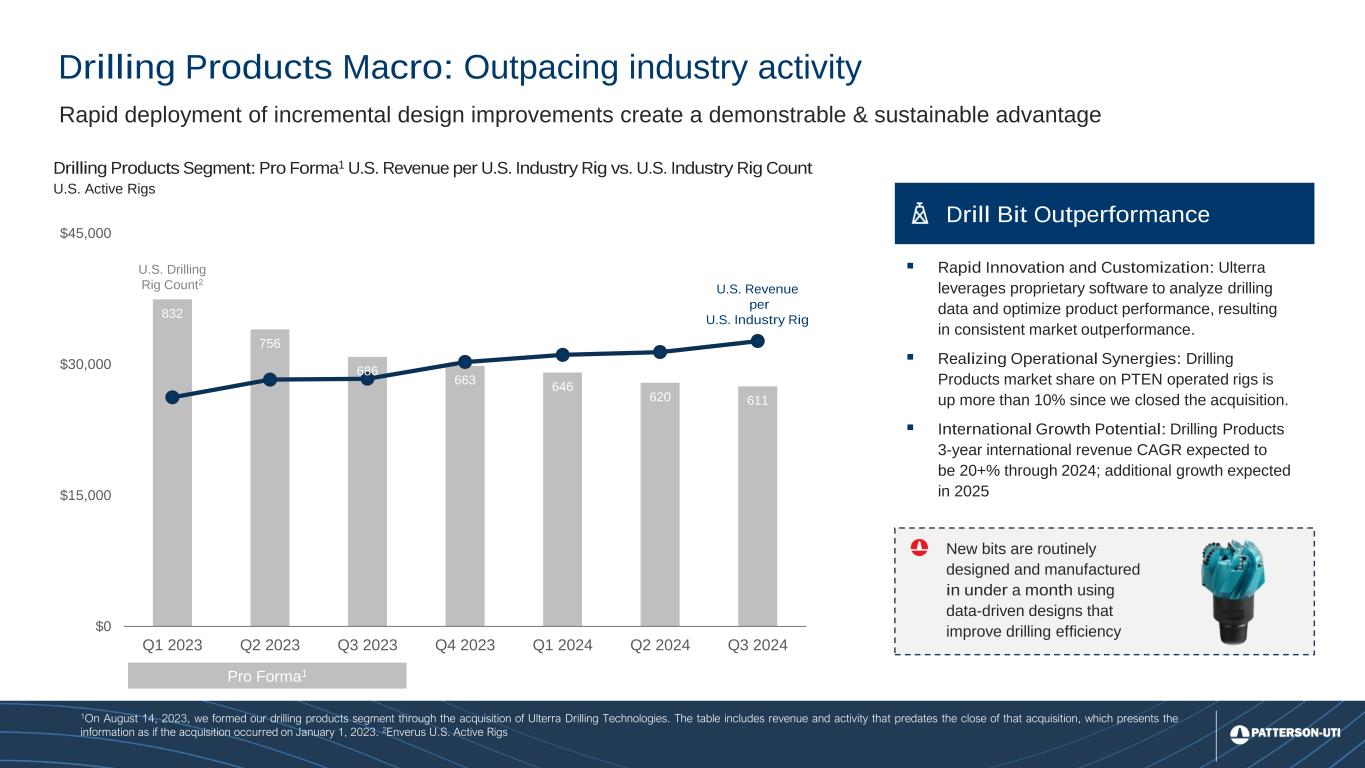 12 832 756 686 663 646 620 611 0 100 200 300 400 500 600 700 800 900 1000 $0 $15,000 $30,000 $45,000 Q1 2023 Q2 2023 Q3 2023 Q4 2023 Q1 2024 Q2 2024 Q3 2024 Drilling Products Macro: Outpacing industry activity Drilling Products Segment: Pro Forma1 U.S. Revenue per U.S. Industry Rig vs. U.S. Industry Rig Count U.S. Active Rigs U.S. Drilling Rig Count2 Rapid deployment of incremental design improvements create a demonstrable & sustainable advantage ▪ Rapid Innovation and Customization: Ulterra leverages proprietary software to analyze drilling data and optimize product performance, resulting in consistent market outperformance. ▪ Realizing Operational Synergies: Drilling Products market share on PTEN operated rigs is up more than 10% since we closed the acquisition. ▪ International Growth Potential: Drilling Products 3-year international revenue CAGR expected to be 20+% through 2024; additional growth expected in 2025 Drill Bit Outperformance New bits are routinely designed and manufactured in under a month using data-driven designs that improve drilling efficiency 1On August 14, 2023, we formed our drilling products segment through the acquisition of Ulterra Drilling Technologies. The table includes revenue and activity that predates the close of that acquisition, which presents the information as if the acquisition occurred on January 1, 2023. 2Enverus U.S. Active Rigs U.S. Revenue per U.S. Industry Rig Pro Forma1
