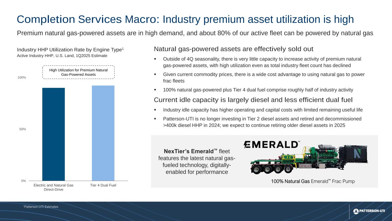 10 Industry HHP Utilization Rate by Engine Type1 Active Industry HHP, U.S. Land, 1Q2025 Estimate Source: 1Patterson-UTI Estimates Natural gas-powered assets are effectively sold out ▪ Outside of 4Q seasonality, there is very little capacity to increase activity of premium natural gas-powered assets, with high utilization even as total industry fleet count has declined ▪ Given current commodity prices, there is a wide cost advantage to using natural gas to power frac fleets ▪ 100% natural gas-powered plus Tier 4 dual fuel comprise roughly half of industry activity Current idle capacity is largely diesel and less efficient dual fuel ▪ Industry idle capacity has higher operating and capital costs with limited remaining useful life ▪ Patterson-UTI is no longer investing in Tier 2 diesel assets and retired and decommissioned >400k diesel HHP in 2024; we expect to continue retiring older diesel assets in 2025 0% 50% 100% Electric and Natural Gas Direct-Drive Tier 4 Dual Fuel High Utilization for Premium Natural Gas-Powered Assets Premium natural gas-powered assets are in high demand, and about 80% of our active fleet can be powered by natural gas 1Patterson-UTI Estimates Completion Services Macro: Industry premium asset utilization is high 100% Natural Gas Emerald™ Frac Pump NexTier’s Emerald™ fleet features the latest natural gas- fueled technology, digitally- enabled for performance