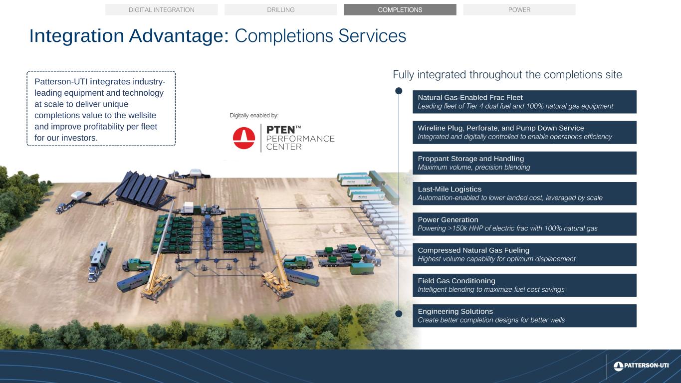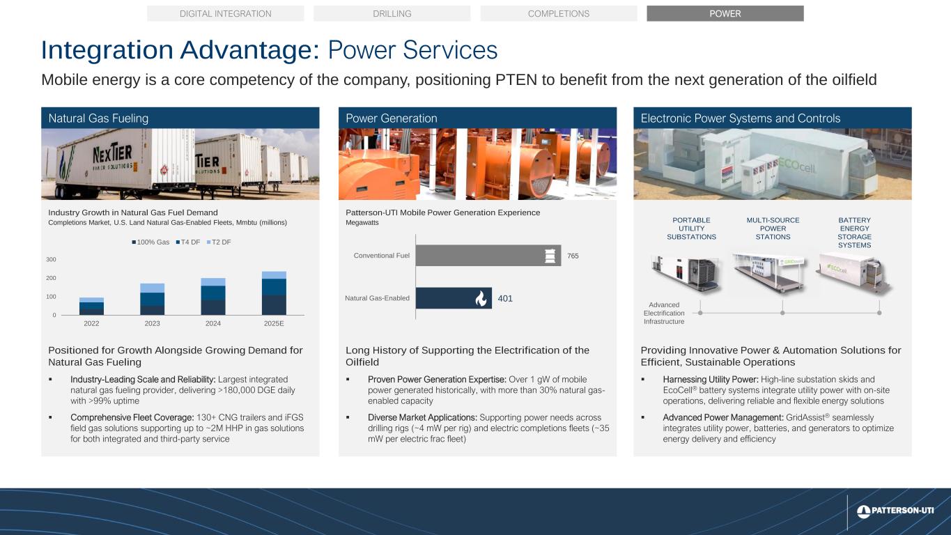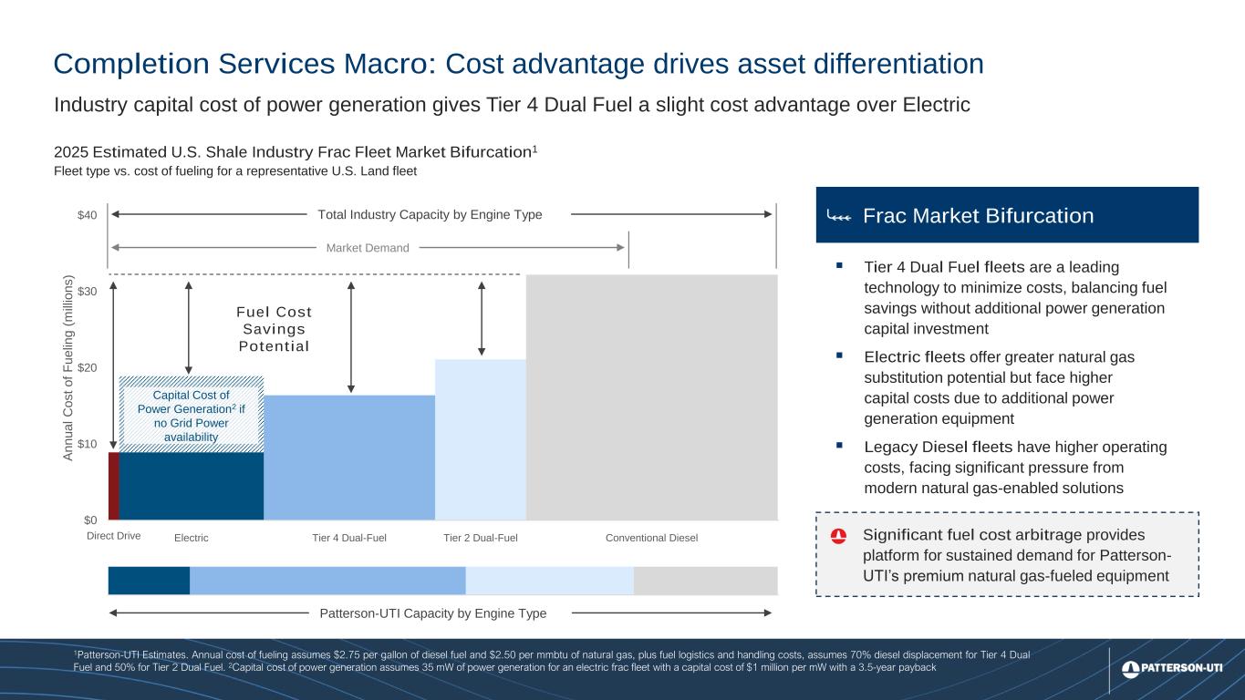 11 Direct Drive Electric Tier 4 Dual-Fuel Tier 2 Dual-Fuel Conventional Diesel $0 $10 $20 $30 $40 A n n u a l C o s t o f F u e lin g ( m ill io n s ) Completion Services Macro: Cost advantage drives asset differentiation 2025 Estimated U.S. Shale Industry Frac Fleet Market Bifurcation1 Fleet type vs. cost of fueling for a representative U.S. Land fleet 1Patterson-UTI Estimates. Annual cost of fueling assumes $2.75 per gallon of diesel fuel and $2.50 per mmbtu of natural gas, plus fuel logistics and handling costs, assumes 70% diesel displacement for Tier 4 Dual Fuel and 50% for Tier 2 Dual Fuel. 2Capital cost of power generation assumes 35 mW of power generation for an electric frac fleet with a capital cost of $1 million per mW with a 3.5-year payback Industry capital cost of power generation gives Tier 4 Dual Fuel a slight cost advantage over Electric Patterson-UTI Capacity by Engine Type Fuel Cost Savings Potential Market Demand Total Industry Capacity by Engine Type Capital Cost of Power Generation2 if no Grid Power availability ▪ Tier 4 Dual Fuel fleets are a leading technology to minimize costs, balancing fuel savings without additional power generation capital investment ▪ Electric fleets offer greater natural gas substitution potential but face higher capital costs due to additional power generation equipment ▪ Legacy Diesel fleets have higher operating costs, facing significant pressure from modern natural gas-enabled solutions Significant fuel cost arbitrage provides platform for sustained demand for Patterson- UTI’s premium natural gas-fueled equipment Frac Market Bifurcation