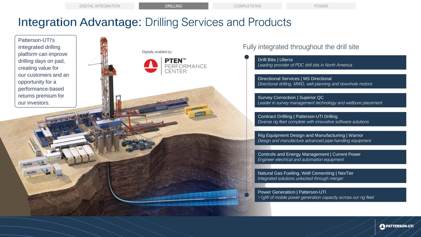 15 Integration Advantage: Drilling Services and Products Contract Drilling | Patterson-UTI Drilling Diverse rig fleet complete with innovative software solutions Natural Gas Fueling, Well Cementing | NexTier Integrated solutions unlocked through merger Drill Bits | Ulterra Leading provider of PDC drill bits in North America Directional Services | MS Directional Directional drilling, MWD, well planning and downhole motors Survey Correction | Superior QC Leader in survey management technology and wellbore placement Power Generation | Patterson-UTI >1gW of mobile power generation capacity across our rig fleet Controls and Energy Management | Current Power Engineer electrical and automation equipment Rig Equipment Design and Manufacturing | Warrior Design and manufacture advanced pipe-handling equipment Fully integrated throughout the drill site DRILLING COMPLETIONS POWERDIGITAL INTEGRATION Patterson-UTI's integrated drilling platform can improve drilling days on pad, creating value for our customers and an opportunity for a performance-based returns premium for our investors. Digitally enabled by: ™