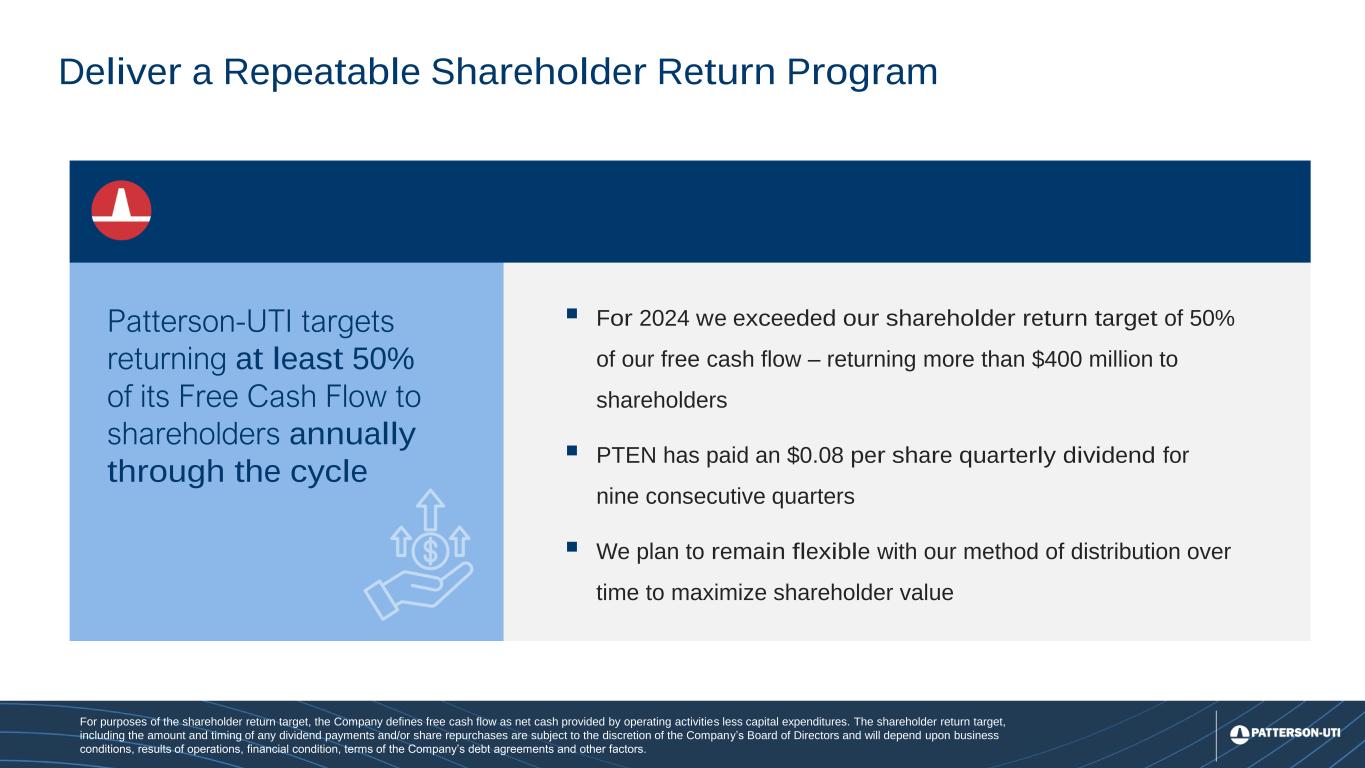 21 ▪ For 2024 we exceeded our shareholder return target of 50% of our free cash flow – returning more than $400 million to shareholders ▪ PTEN has paid an $0.08 per share quarterly dividend for nine consecutive quarters ▪ We plan to remain flexible with our method of distribution over time to maximize shareholder value Patterson-UTI targets returning at least 50% of its Free Cash Flow to shareholders annually through the cycle Deliver a Repeatable Shareholder Return Program For purposes of the shareholder return target, the Company defines free cash flow as net cash provided by operating activities less capital expenditures. The shareholder return target, including the amount and timing of any dividend payments and/or share repurchases are subject to the discretion of the Company’s Board of Directors and will depend upon business conditions, results of operations, financial condition, terms of the Company’s debt agreements and other factors.