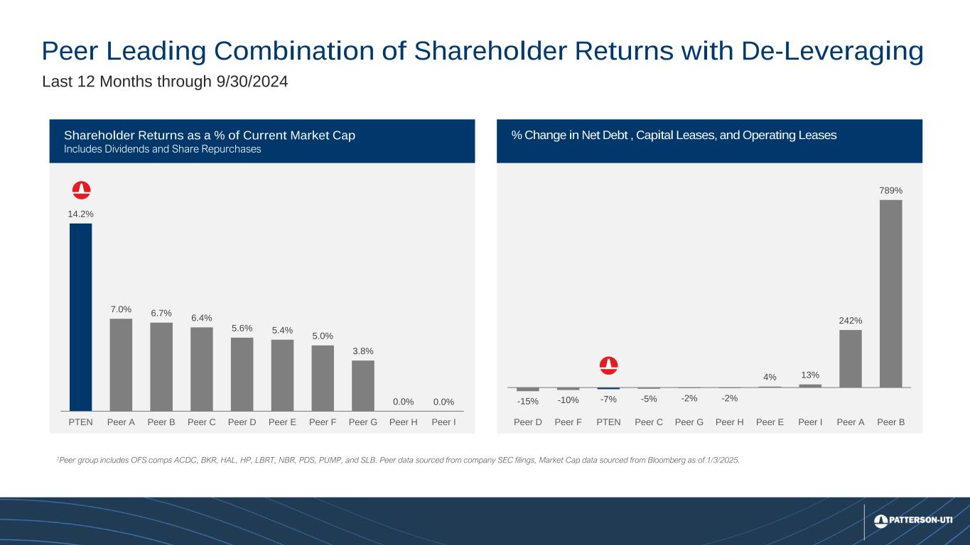 22 Shareholder Returns as a % of Current Market Cap Includes Dividends and Share Repurchases Shareholder Returns as a % of Current Market Cap Includes Dividends and Share Repurchases 1Peer group includes OFS comps ACDC, BKR, HAL, HP, LBRT, NBR, PDS, PUMP, and SLB. Peer data sourced from company SEC filings, Market Cap data sourced from Bloomberg as of 1/3/2025. Peer Leading Combination of Shareholder Returns with De-Leveraging Last 12 Months through 9/30/2024 % Change in Net Debt , Capital Leases, and Operating Leases 14.2% 7.0% 6.7% 6.4% 5.6% 5.4% 5.0% 3.8% 0.0% 0.0% PTEN Peer A Peer B Peer C Peer D Peer E Peer F Peer G Peer H Peer I -15% -10% -7% -5% -2% -2% 4% 13% 242% 789% Peer D Peer F PTEN Peer C Peer G Peer H Peer E Peer I Peer A Peer B