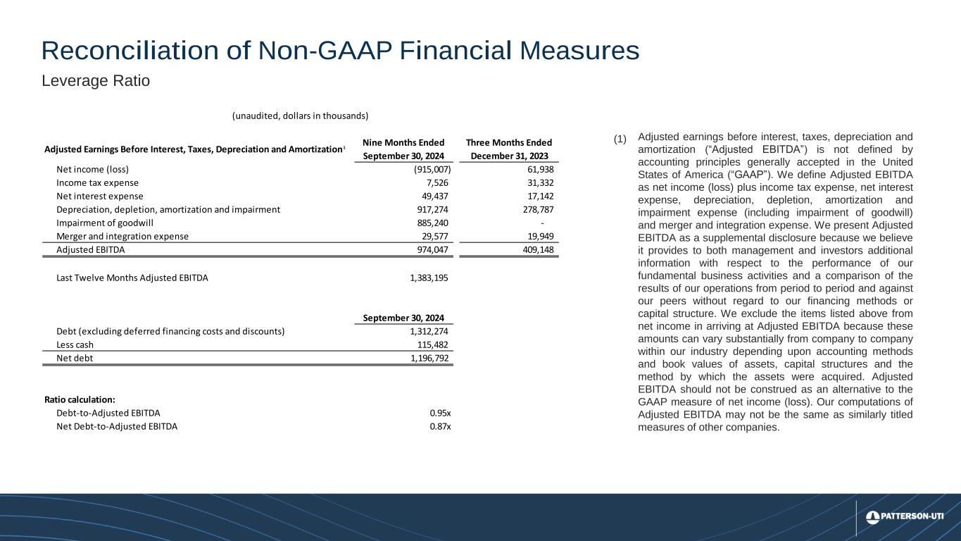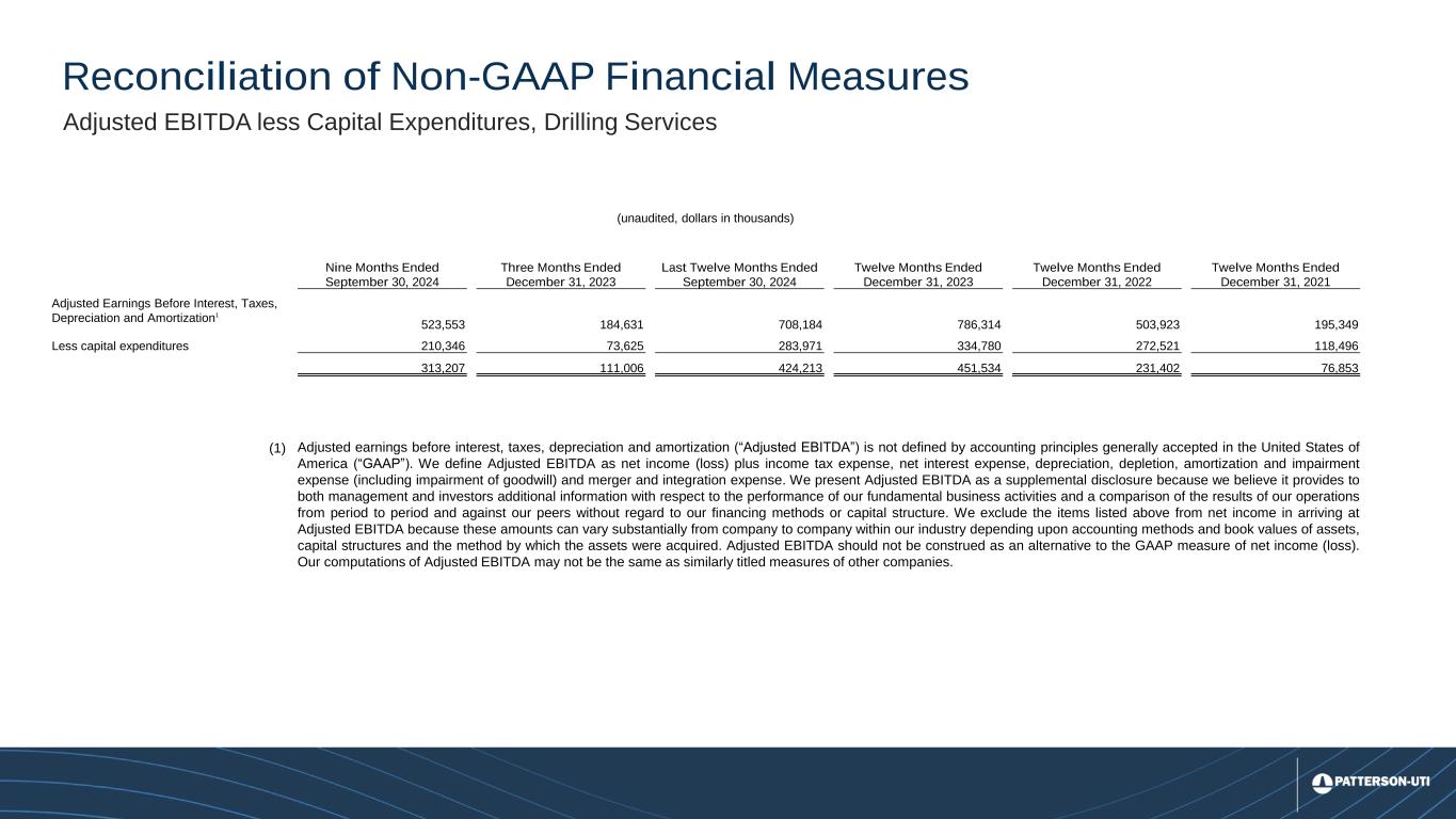 26 Reconciliation of Non-GAAP Financial Measures (unaudited, dollars in thousands) Nine Months Ended September 30, 2024 Three Months Ended December 31, 2023 Last Twelve Months Ended September 30, 2024 Twelve Months Ended December 31, 2023 Twelve Months Ended December 31, 2022 Twelve Months Ended December 31, 2021 Adjusted Earnings Before Interest, Taxes, Depreciation and Amortization1 523,553 184,631 708,184 786,314 503,923 195,349 Less capital expenditures 210,346 73,625 283,971 334,780 272,521 118,496 313,207 111,006 424,213 451,534 231,402 76,853 (1) Adjusted earnings before interest, taxes, depreciation and amortization (“Adjusted EBITDA”) is not defined by accounting principles generally accepted in the United States of America (“GAAP”). We define Adjusted EBITDA as net income (loss) plus income tax expense, net interest expense, depreciation, depletion, amortization and impairment expense (including impairment of goodwill) and merger and integration expense. We present Adjusted EBITDA as a supplemental disclosure because we believe it provides to both management and investors additional information with respect to the performance of our fundamental business activities and a comparison of the results of our operations from period to period and against our peers without regard to our financing methods or capital structure. We exclude the items listed above from net income in arriving at Adjusted EBITDA because these amounts can vary substantially from company to company within our industry depending upon accounting methods and book values of assets, capital structures and the method by which the assets were acquired. Adjusted EBITDA should not be construed as an alternative to the GAAP measure of net income (loss). Our computations of Adjusted EBITDA may not be the same as similarly titled measures of other companies. Adjusted EBITDA less Capital Expenditures, Drilling Services