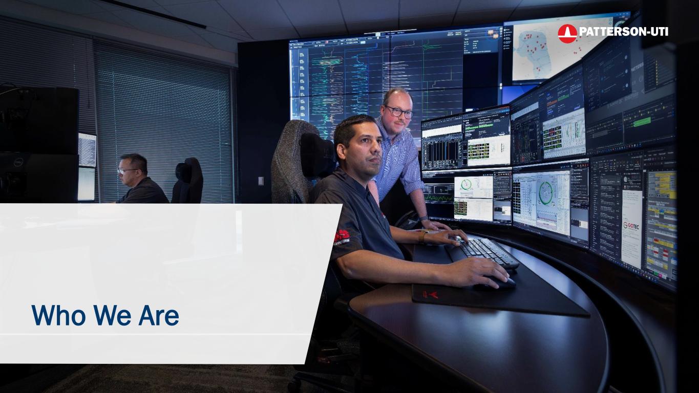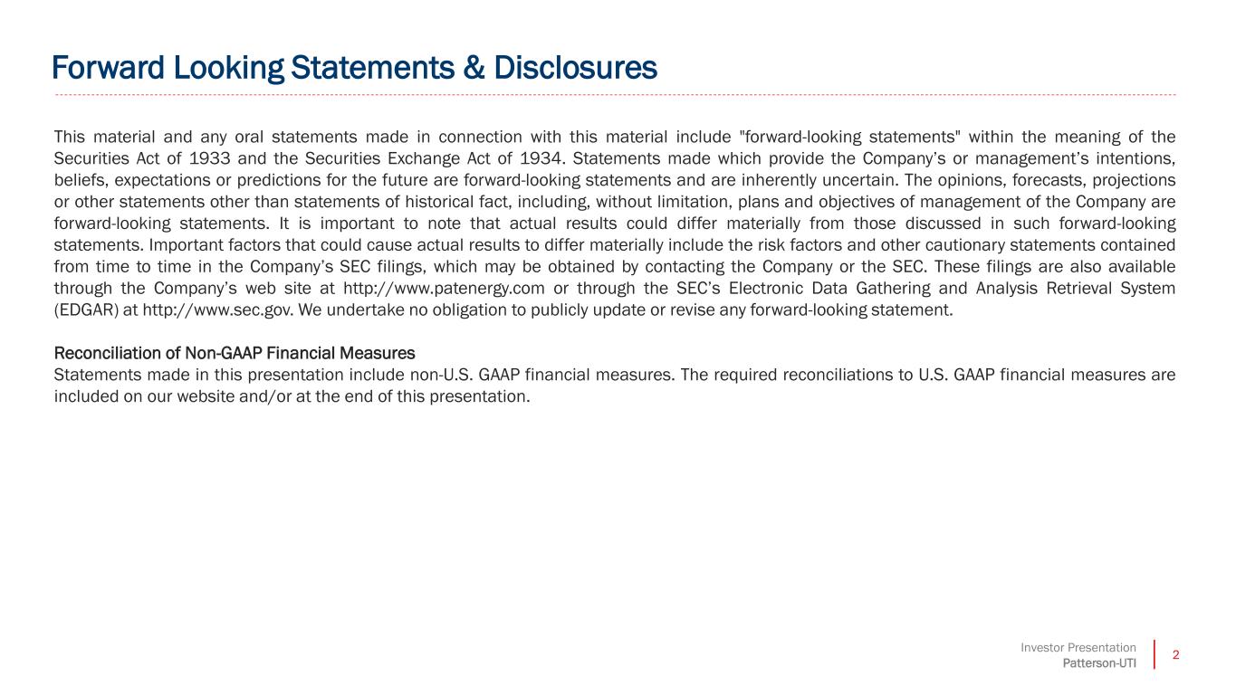 2Investor Presentation Patterson-UTI This material and any oral statements made in connection with this material include "forward-looking statements" within the meaning of the Securities Act of 1933 and the Securities Exchange Act of 1934. Statements made which provide the Company’s or management’s intentions, beliefs, expectations or predictions for the future are forward-looking statements and are inherently uncertain. The opinions, forecasts, projections or other statements other than statements of historical fact, including, without limitation, plans and objectives of management of the Company are forward-looking statements. It is important to note that actual results could differ materially from those discussed in such forward-looking statements. Important factors that could cause actual results to differ materially include the risk factors and other cautionary statements contained from time to time in the Company’s SEC filings, which may be obtained by contacting the Company or the SEC. These filings are also available through the Company’s web site at http://www.patenergy.com or through the SEC’s Electronic Data Gathering and Analysis Retrieval System (EDGAR) at http://www.sec.gov. We undertake no obligation to publicly update or revise any forward-looking statement. Reconciliation of Non-GAAP Financial Measures Statements made in this presentation include non-U.S. GAAP financial measures. The required reconciliations to U.S. GAAP financial measures are included on our website and/or at the end of this presentation. Forward Looking Statements & Disclosures