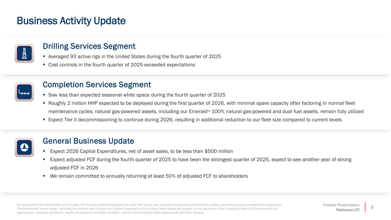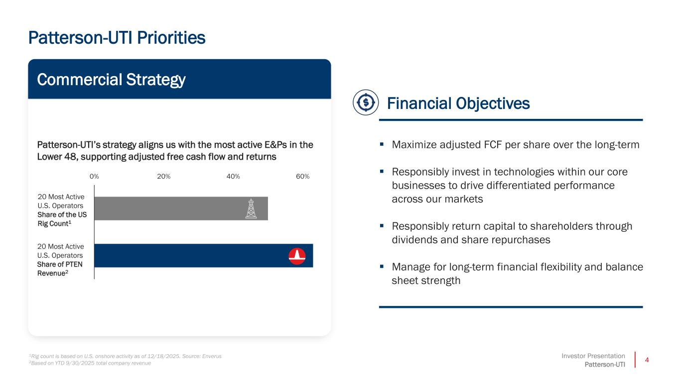 3Investor Presentation Patterson-UTI Z Z For purposes of the shareholder return target, the Company defines adjusted free cash flow as net cash provided by operating activities less capital expenditures plus proceeds from asset sales. The shareholder return target, including the amount and timing of any dividend payments and/or share repurchases are subject to the discretion of the Company’s Board of Directors and will depend upon business conditions, results of operations, financial condition, terms of the Company’s debt agreements and other factors. Z Business Activity Update Drilling Services Segment ▪ Averaged 93 active rigs in the United States during the fourth quarter of 2025 ▪ Cost controls in the fourth quarter of 2025 exceeded expectations Completion Services Segment ▪ Saw less than expected seasonal white space during the fourth quarter of 2025 ▪ Roughly 2 million HHP expected to be deployed during the first quarter of 2026, with minimal spare capacity after factoring in normal fleet maintenance cycles; natural gas-powered assets, including our EmeraldTM 100% natural gas-powered and dual fuel assets, remain fully utilized ▪ Expect Tier II decommissioning to continue during 2026, resulting in additional reduction to our fleet size compared to current levels General Business Update ▪ Expect 2026 Capital Expenditures, net of asset sales, to be less than $500 million ▪ Expect adjusted FCF during the fourth quarter of 2025 to have been the strongest quarter of 2025, expect to see another year of strong adjusted FCF in 2026 ▪ We remain committed to annually returning at least 50% of adjusted FCF to shareholders