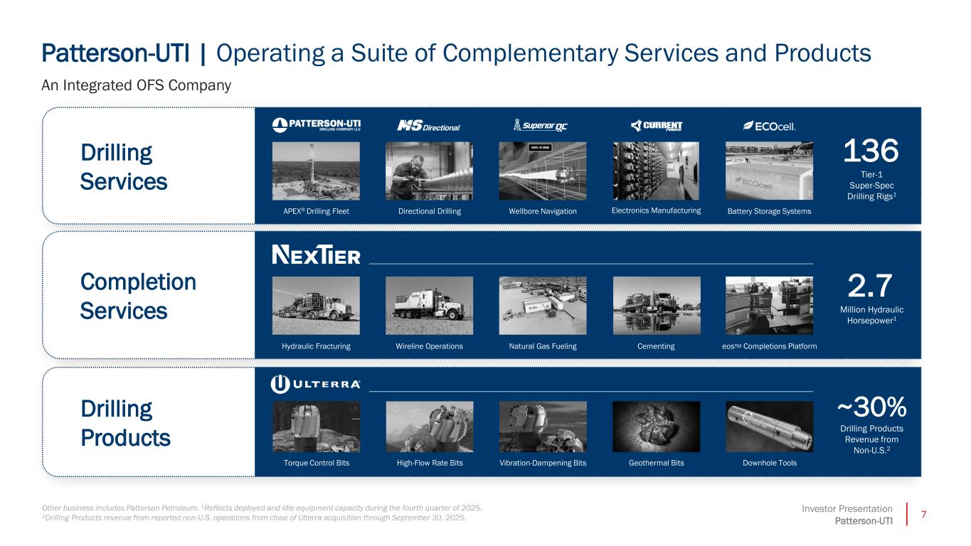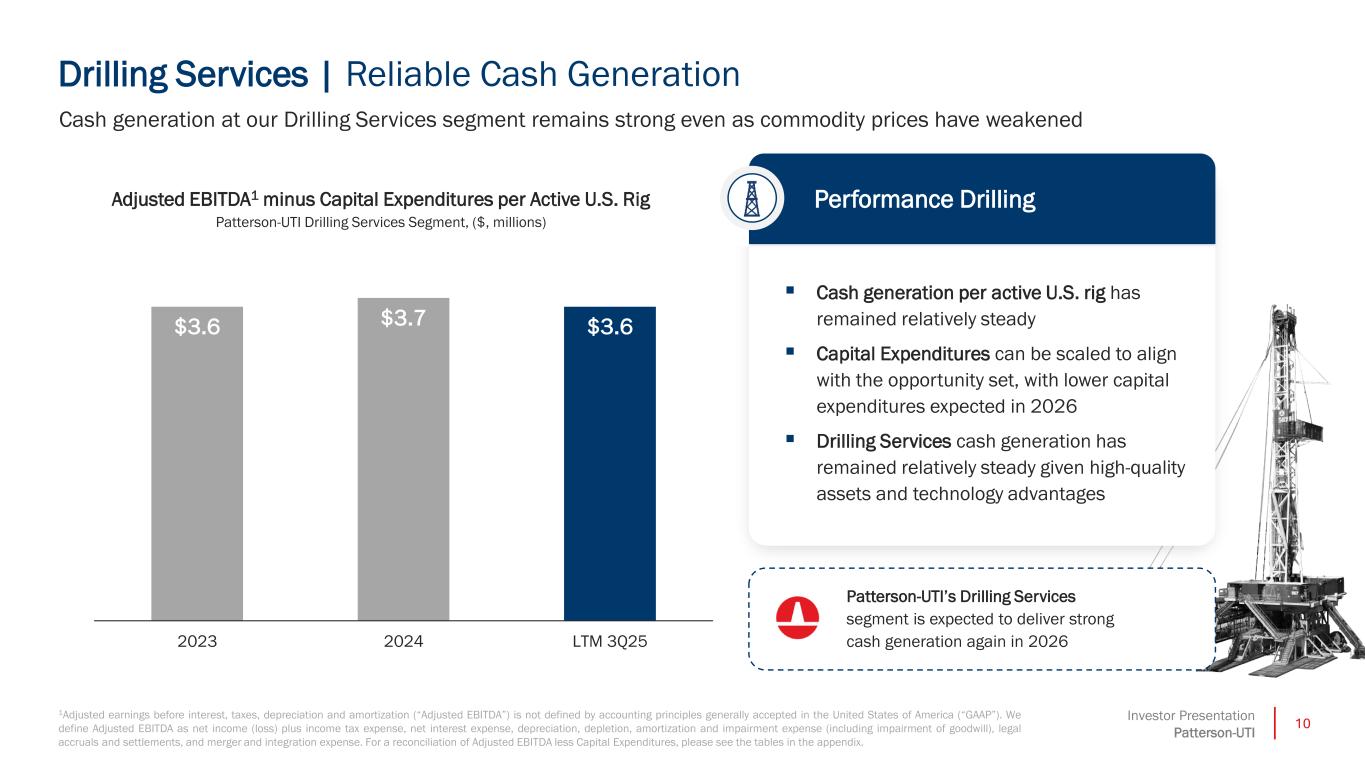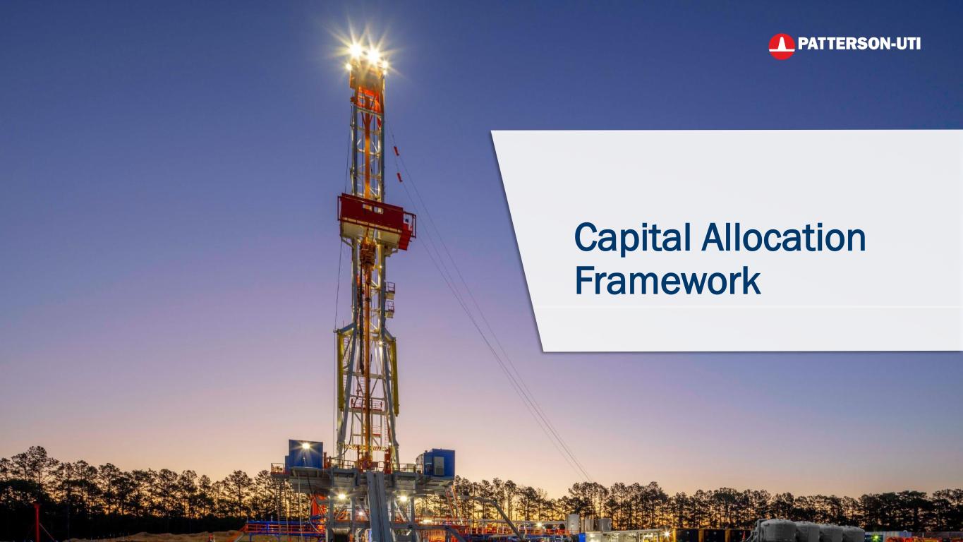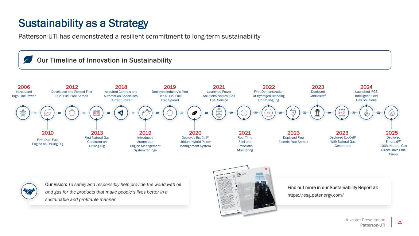 24Investor Presentation Patterson-UTI Shareholder Returns as a % of Current Market Cap Last 12 Months through 9/30/2025. Includes Dividends and Share Repurchases Shareholder Returns as a % of Current Market Cap Includes Dividends and Share Repurchases 1Peer group includes OFS comps ACDC, BKR, HAL, LBRT, NBR, PDS, PUMP, and SLB. Peer data sourced from company SEC filings, Market Cap data sourced from Bloomberg as of 12/30/2025. Peer Leading Combination of Shareholder Returns with Net Debt Reduction 9% 8% 7% 6% 4% 3% 0% 0% 0% PTEN Peer A Peer B Peer C Peer D Peer E Peer F Peer G Peer H % Change i Net Debt, C pital Leases, and Operating Leases Last 12 Months through 9/30/2025 -18% -17% -10% -8% 0% 0% 8% 9% 37% Peer G Peer C Peer H PTEN Peer E Peer B Peer F Peer A Peer D