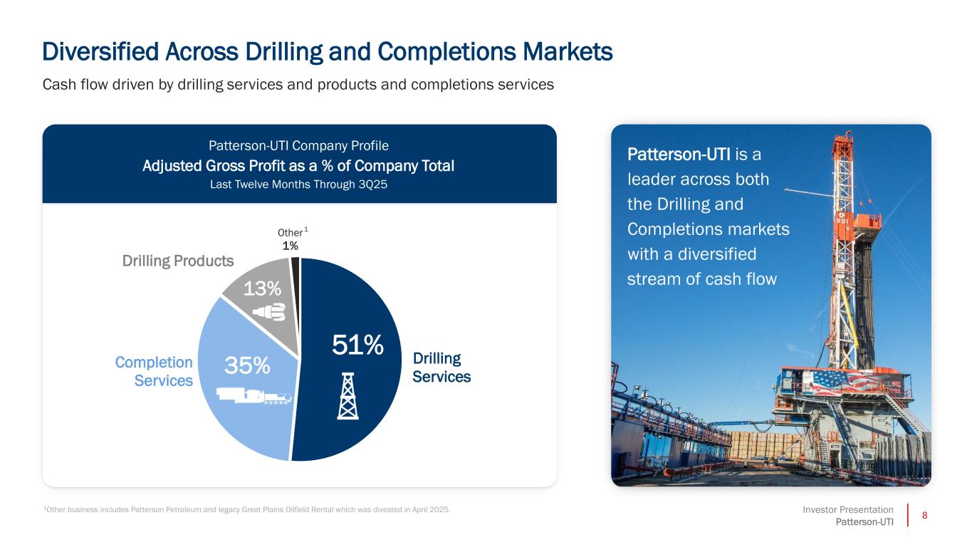7Investor Presentation Patterson-UTI Z Z Z Hydraulic Fracturing Wireline Operations Natural Gas Fueling Cementing eosTM Completions Platform 2.7 Million Hydraulic Horsepower1 Other business includes Patterson Petroleum. 1Reflects deployed and idle equipment capacity during the fourth quarter of 2025. 2Drilling Products revenue from reported non-U.S. operations from close of Ulterra acquisition through September 30, 2025. 136 Tier-1 Super-Spec Drilling Rigs1 APEX® Drilling Fleet Wellbore Navigation Battery Storage SystemsElectronics ManufacturingDirectional Drilling Torque Control Bits High-Flow Rate Bits Vibration-Dampening Bits Geothermal Bits Downhole Tools ~30% Drilling Products Revenue from Non-U.S.2 Patterson-UTI | Operating a Suite of Complementary Services and Products An Integrated OFS Company Drilling Services Completion Services Drilling Products