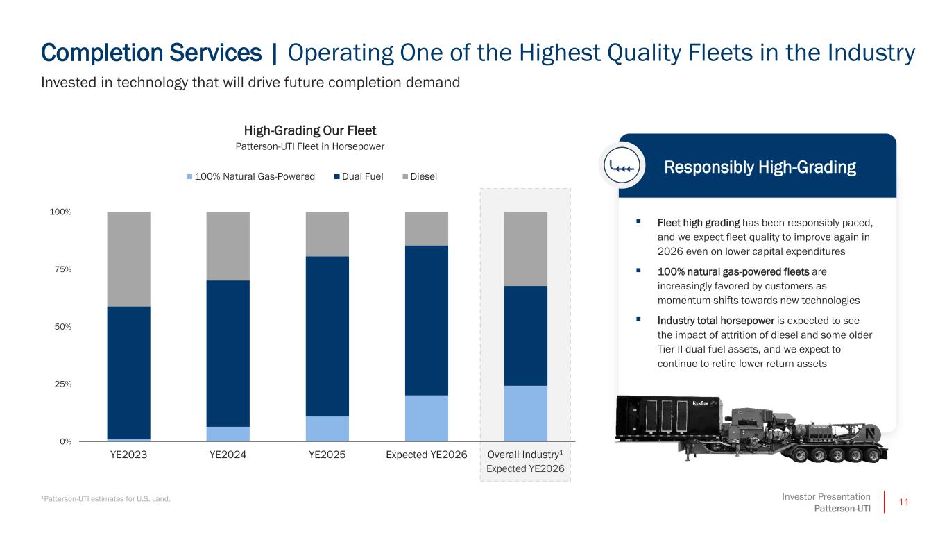 10Investor Presentation Patterson-UTI Drilling Services | Reliable Cash Generation Adjusted EBITDA1 minus Capital Expenditures per Active U.S. Rig Patterson-UTI Drilling Services Segment, ($, millions) Cash generation at our Drilling Services segment remains strong even as commodity prices have weakened 1Adjusted earnings before interest, taxes, depreciation and amortization (“Adjusted EBITDA”) is not defined by accounting principles generally accepted in the United States of America (“GAAP”). We define Adjusted EBITDA as net income (loss) plus income tax expense, net interest expense, depreciation, depletion, amortization and impairment expense (including impairment of goodwill), legal accruals and settlements, and merger and integration expense. For a reconciliation of Adjusted EBITDA less Capital Expenditures, please see the tables in the appendix. $3.6 $3.7 $3.6 2023 2024 LTM 3Q25 Performance Drilling ▪ Cash generation per active U.S. rig has remained relatively steady ▪ Capital Expenditures can be scaled to align with the opportunity set, with lower capital expenditures expected in 2026 ▪ Drilling Services cash generation has remained relatively steady given high-quality assets and technology advantages Patterson-UTI’s Drilling Services segment is expected to deliver strong cash generation again in 2026
