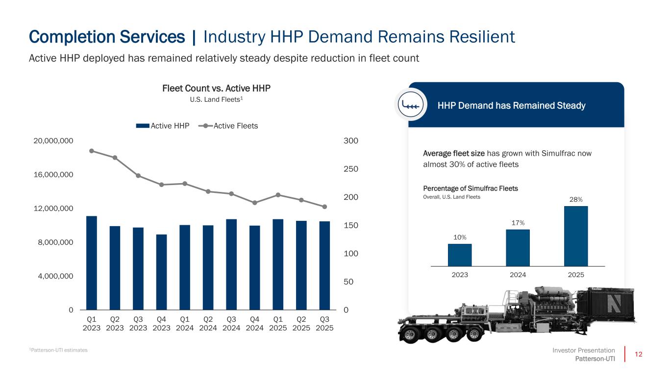 11Investor Presentation Patterson-UTI Completion Services | Operating One of the Highest Quality Fleets in the Industry Invested in technology that will drive future completion demand Responsibly High-Grading ▪ Fleet high grading has been responsibly paced, and we expect fleet quality to improve again in 2026 even on lower capital expenditures ▪ 100% natural gas-powered fleets are increasingly favored by customers as momentum shifts towards new technologies ▪ Industry total horsepower is expected to see the impact of attrition of diesel and some older Tier II dual fuel assets, and we expect to continue to retire lower return assets High-Grading Our Fleet Patterson-UTI Fleet in Horsepower 1Patterson-UTI estimates for U.S. Land. 0% 25% 50% 75% 100% YE2023 YE2024 YE2025 Expected YE2026 Overall Industry 100% Natural Gas-Powered Dual Fuel Diesel Overal Industry1 Expected YE2026