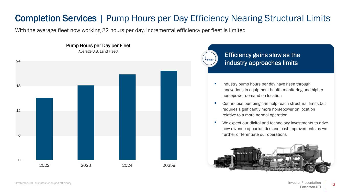 12Investor Presentation Patterson-UTI Completion Services | Industry HHP Demand Remains Resilient Fleet Count vs. Active HHP U.S. Land Fleets1 Active HHP deployed has remained relatively steady despite reduction in fleet count HHP Demand has Remained Steady Average fleet size has grown with Simulfrac now almost 30% of active fleets 0 50 100 150 200 250 300 0 4,000,000 8,000,000 12,000,000 16,000,000 20,000,000 Q1 2023 Q2 2023 Q3 2023 Q4 2023 Q1 2024 Q2 2024 Q3 2024 Q4 2024 Q1 2025 Q2 2025 Q3 2025 Active HHP Active Fleets 1Patterson-UTI estimates 10% 17% 28% 2023 2024 2025 Percentage of Simulfrac Fleets Overall, U.S. Land Fleets
