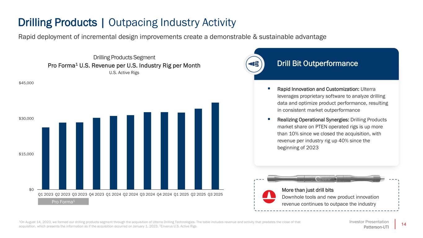13Investor Presentation Patterson-UTI Completion Services | Pump Hours per Day Efficiency Nearing Structural Limits Pump Hours per Day per Fleet Average U.S. Land Fleet1 With the average fleet now working 22 hours per day, incremental efficiency per fleet is limited 0 6 12 18 24 2022 2023 2024 2025e 1Patterson-UTI Estimates for on-pad efficiency Efficiency gains slow as the industry approaches limits ▪ Industry pump hours per day have risen through innovations in equipment health monitoring and higher horsepower demand on location ▪ Continuous pumping can help reach structural limits but requires significantly more horsepower on location relative to a more normal operation ▪ We expect our digital and technology investments to drive new revenue opportunities and cost improvements as we further differentiate our operations