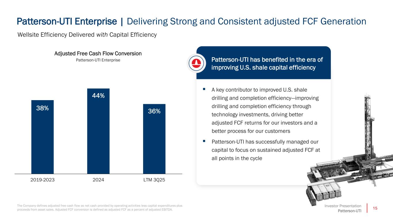 14Investor Presentation Patterson-UTI Drilling Products | Outpacing Industry Activity Rapid deployment of incremental design improvements create a demonstrable & sustainable advantage 1On August 14, 2023, we formed our drilling products segment through the acquisition of Ulterra Drilling Technologies. The table includes revenue and activity that predates the close of that acquisition, which presents the information as if the acquisition occurred on January 1, 2023. 2Enverus U.S. Active Rigs Drill Bit Outperformance ▪ Rapid Innovation and Customization: Ulterra leverages proprietary software to analyze drilling data and optimize product performance, resulting in consistent market outperformance ▪ Realizing Operational Synergies: Drilling Products market share on PTEN operated rigs is up more than 10% since we closed the acquisition, with revenue per industry rig up 40% since the beginning of 2023 $0 $15,000 $30,000 $45,000 Q1 2023 Q2 2023 Q3 2023 Q4 2023 Q1 2024 Q2 2024 Q3 2024 Q4 2024 Q1 2025 Q2 2025 Q3 2025 Pro Forma1 Drilling Products Segment Pro Forma1 U.S. Revenue per U.S. Industry Rig per Month U.S. Active Rigs More than just drill bits Downhole tools and new product innovation revenue continues to outpace the industry