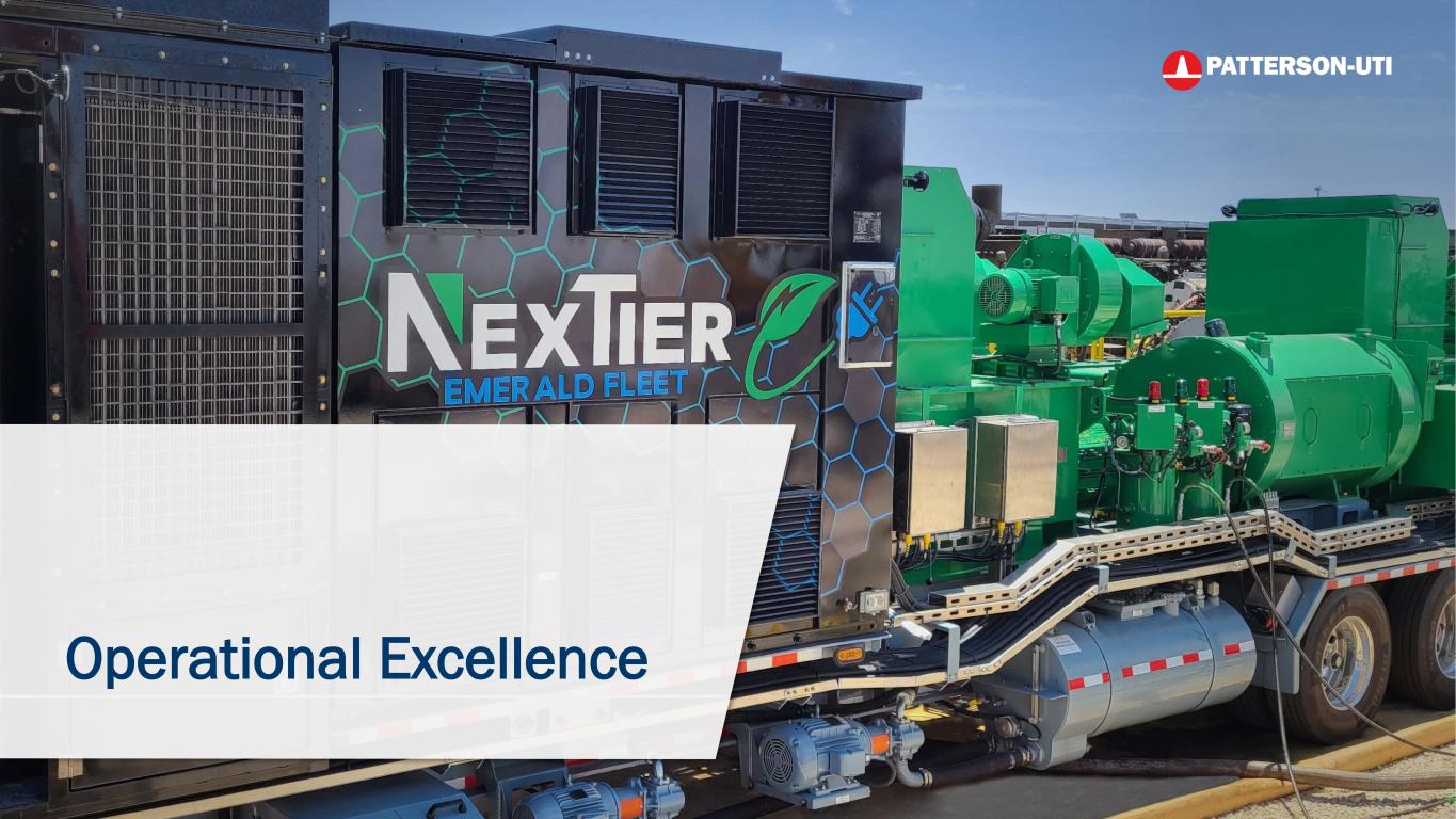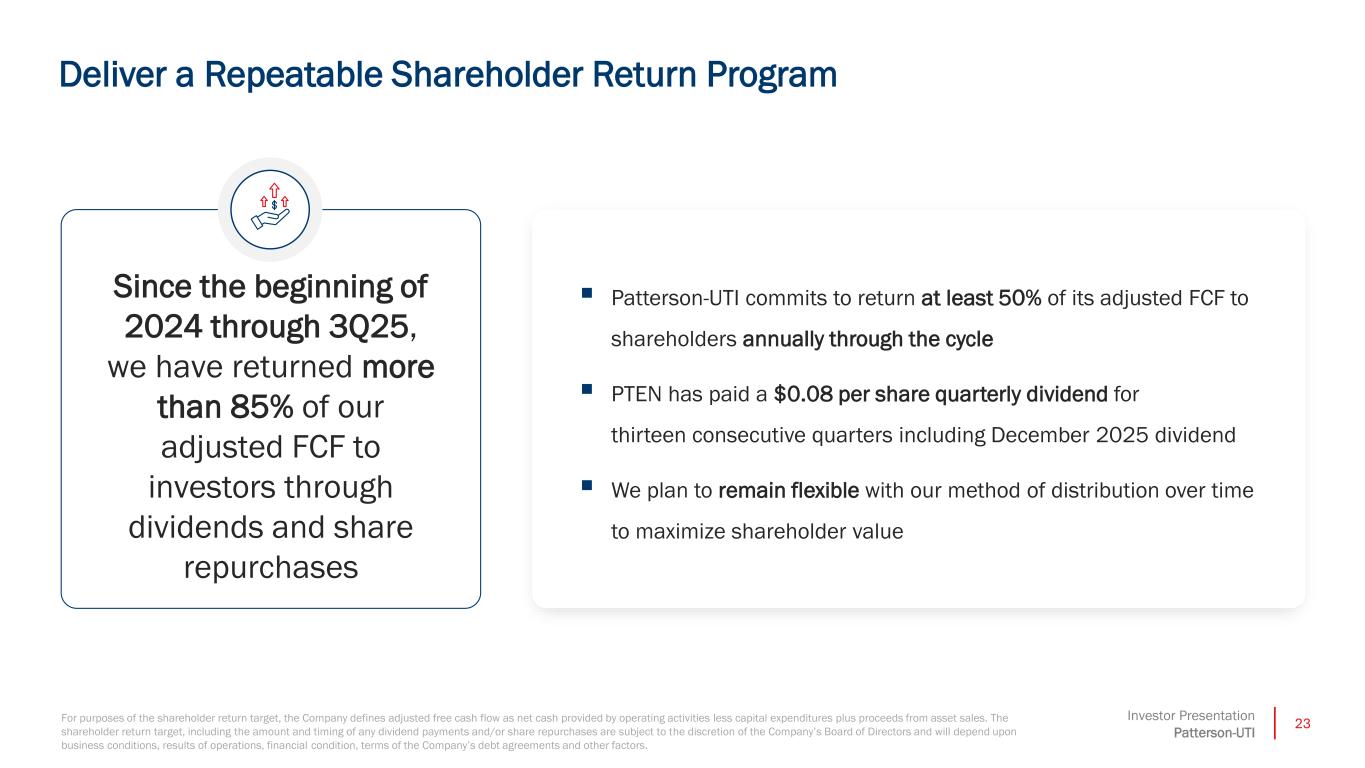 22Investor Presentation Patterson-UTI Z TOTAL LIQUIDITY $682 M Includes cash and revolver as of 9/30/2025 LOW LEVERAGE ~1 X Net Debt as of 9/30/2025 to LTM adjusted EBITDA CASH BALANCE $187 M Cash Position as of 9/30/2025 INTEREST COVERAGE 14 X LTM adjusted EBITDA to Net Interest Expense NEAREST SENIOR NOTE MATURITY 2028 CREDIT RATING Investment Grade Moody's, S&P, and Fitch Investment Grade Capital Structure Financially Positioned for Through-Cycle Resilience