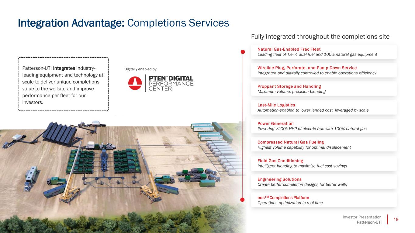 18Investor Presentation Patterson-UTI Patterson-UTI's integrated drilling platform can improve drilling days on pad, creating value for our customers and an opportunity for a performance-based returns premium for our investors. Integration Advantage: Drilling Services and Products Digitally enabled by: Contract Drilling | Patterson-UTI Drilling Diverse rig fleet complete with innovative software solutions Natural Gas Fueling, Well Cementing | NexTier Integrated solutions unlocked through merger Drill Bits | Ulterra Leading provider of PDC drill bits in North America Directional Services | MS Directional Directional drilling, MWD, well planning and downhole motors Survey Correction | Superior QC Leader in survey management technology and wellbore placement Power Generation | Patterson-UTI >1gW of mobile power generation capacity across our rig fleet Controls and Energy Management | Current Power Engineer electrical and automation equipment Rig Equipment Design and Manufacturing | Patterson-UTI Drilling Design and manufacture advanced pipe-handling equipment Fully integrated throughout the drill site