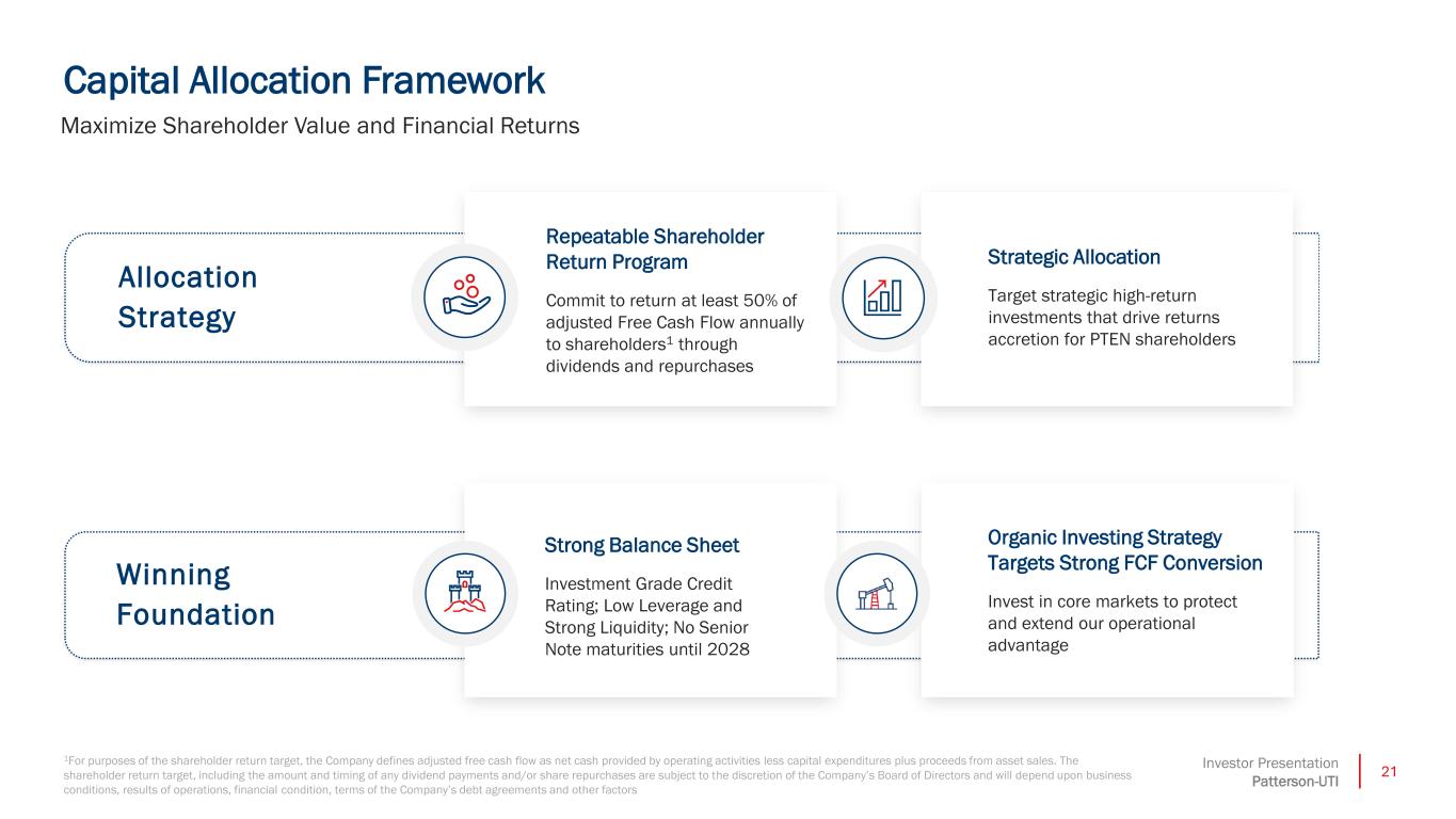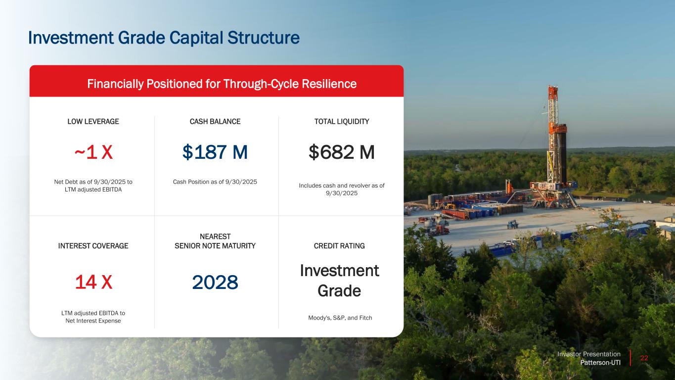 21Investor Presentation Patterson-UTI Organic Investing Strategy Targets Strong FCF Conversion Invest in core markets to protect and extend our operational advantage Strategic Allocation Target strategic high-return investments that drive returns accretion for PTEN shareholders Winning Foundation Allocation Strategy Strong Balance Sheet Investment Grade Credit Rating; Low Leverage and Strong Liquidity; No Senior Note maturities until 2028 Repeatable Shareholder Return Program Commit to return at least 50% of adjusted Free Cash Flow annually to shareholders1 through dividends and repurchases Capital Allocation Framework Maximize Shareholder Value and Financial Returns 1For purposes of the shareholder return target, the Company defines adjusted free cash flow as net cash provided by operating activities less capital expenditures plus proceeds from asset sales. The shareholder return target, including the amount and timing of any dividend payments and/or share repurchases are subject to the discretion of the Company’s Board of Directors and will depend upon business conditions, results of operations, financial condition, terms of the Company’s debt agreements and other factors