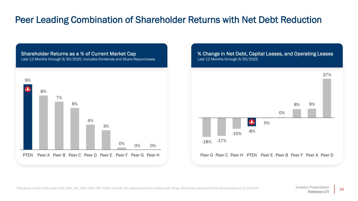 23Investor Presentation Patterson-UTI Deliver a Repeatable Shareholder Return Program For purposes of the shareholder return target, the Company defines adjusted free cash flow as net cash provided by operating activities less capital expenditures plus proceeds from asset sales. The shareholder return target, including the amount and timing of any dividend payments and/or share repurchases are subject to the discretion of the Company’s Board of Directors and will depend upon business conditions, results of operations, financial condition, terms of the Company’s debt agreements and other factors. Since the beginning of 2024 through 3Q25, we have returned more than 85% of our adjusted FCF to investors through dividends and share repurchases ▪ Patterson-UTI commits to return at least 50% of its adjusted FCF to shareholders annually through the cycle ▪ PTEN has paid a $0.08 per share quarterly dividend for thirteen consecutive quarters including December 2025 dividend ▪ We plan to remain flexible with our method of distribution over time to maximize shareholder value