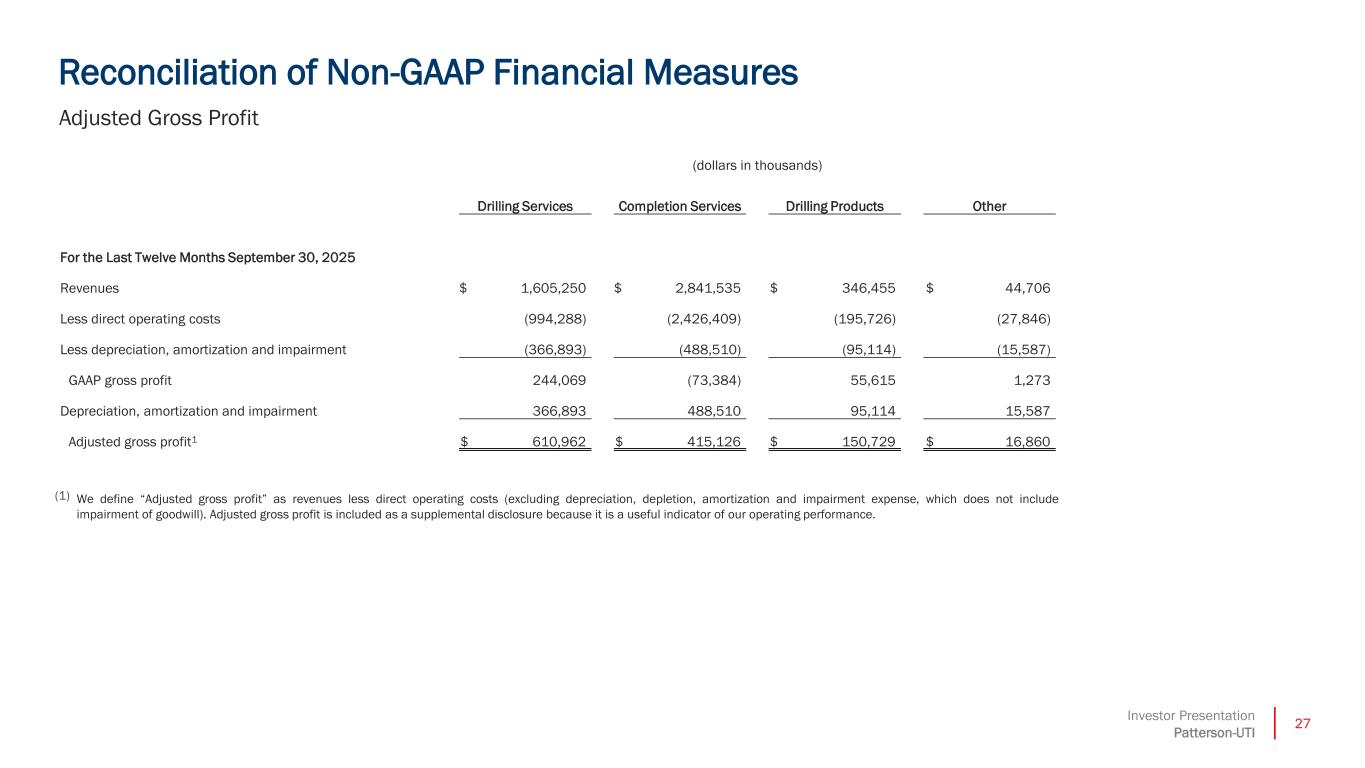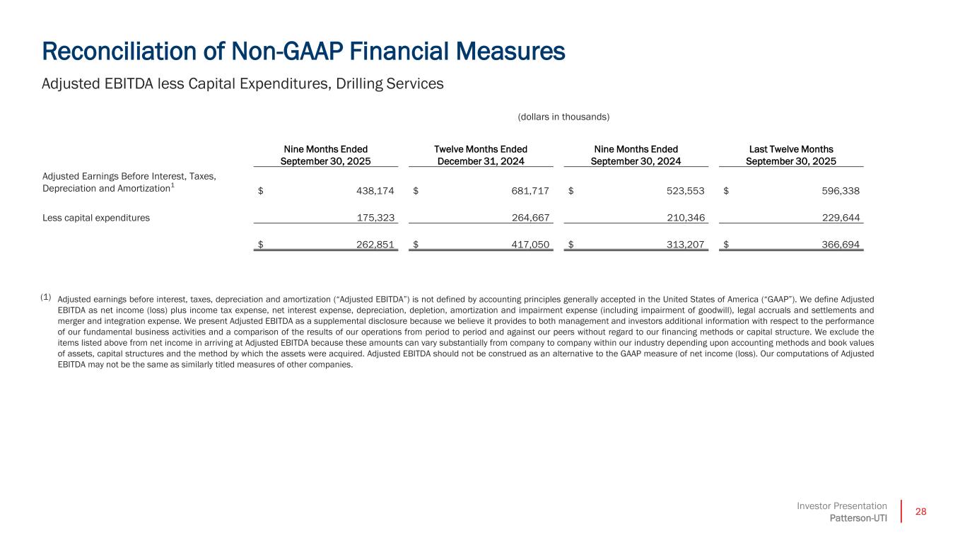 27Investor Presentation Patterson-UTI Reconciliation of Non-GAAP Financial Measures Adjusted Gross Profit (dollars in thousands) Drilling Services Completion Services Drilling Products Other For the Last Twelve Months September 30, 2025 Revenues $ 1,605,250 $ 2,841,535 $ 346,455 $ 44,706 Less direct operating costs (994,288) (2,426,409) (195,726) (27,846) Less depreciation, amortization and impairment (366,893) (488,510) (95,114) (15,587) GAAP gross profit 244,069 (73,384) 55,615 1,273 Depreciation, amortization and impairment 366,893 488,510 95,114 15,587 Adjusted gross profit1 $ 610,962 $ 415,126 $ 150,729 $ 16,860 (1) We define “Adjusted gross profit” as revenues less direct operating costs (excluding depreciation, depletion, amortization and impairment expense, which does not include impairment of goodwill). Adjusted gross profit is included as a supplemental disclosure because it is a useful indicator of our operating performance.