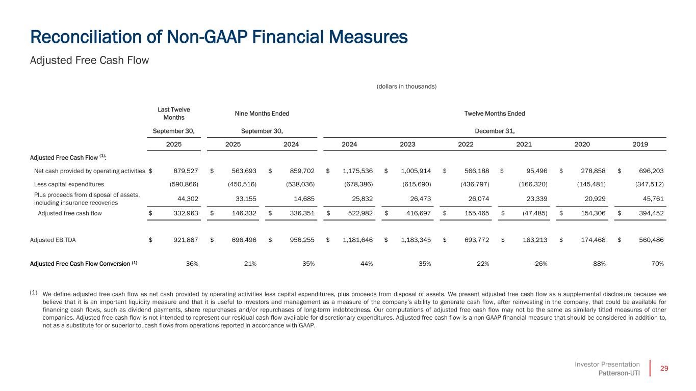28Investor Presentation Patterson-UTI Reconciliation of Non-GAAP Financial Measures Adjusted EBITDA less Capital Expenditures, Drilling Services (1) Adjusted earnings before interest, taxes, depreciation and amortization (“Adjusted EBITDA”) is not defined by accounting principles generally accepted in the United States of America (“GAAP”). We define Adjusted EBITDA as net income (loss) plus income tax expense, net interest expense, depreciation, depletion, amortization and impairment expense (including impairment of goodwill), legal accruals and settlements and merger and integration expense. We present Adjusted EBITDA as a supplemental disclosure because we believe it provides to both management and investors additional information with respect to the performance of our fundamental business activities and a comparison of the results of our operations from period to period and against our peers without regard to our financing methods or capital structure. We exclude the items listed above from net income in arriving at Adjusted EBITDA because these amounts can vary substantially from company to company within our industry depending upon accounting methods and book values of assets, capital structures and the method by which the assets were acquired. Adjusted EBITDA should not be construed as an alternative to the GAAP measure of net income (loss). Our computations of Adjusted EBITDA may not be the same as similarly titled measures of other companies. (dollars in thousands) Nine Months Ended September 30, 2025 Twelve Months Ended December 31, 2024 Nine Months Ended September 30, 2024 Last Twelve Months September 30, 2025 Adjusted Earnings Before Interest, Taxes, Depreciation and Amortization1 $ 438,174 $ 681,717 $ 523,553 $ 596,338 Less capital expenditures 175,323 264,667 210,346 229,644 $ 262,851 $ 417,050 $ 313,207 $ 366,694