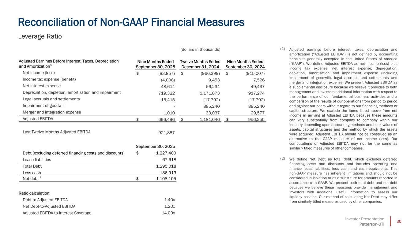 29Investor Presentation Patterson-UTI Reconciliation of Non-GAAP Financial Measures Adjusted Free Cash Flow (1) We define adjusted free cash flow as net cash provided by operating activities less capital expenditures, plus proceeds from disposal of assets. We present adjusted free cash flow as a supplemental disclosure because we believe that it is an important liquidity measure and that it is useful to investors and management as a measure of the company’s ability to generate cash flow, after reinvesting in the company, that could be available for financing cash flows, such as dividend payments, share repurchases and/or repurchases of long-term indebtedness. Our computations of adjusted free cash flow may not be the same as similarly titled measures of other companies. Adjusted free cash flow is not intended to represent our residual cash flow available for discretionary expenditures. Adjusted free cash flow is a non-GAAP financial measure that should be considered in addition to, not as a substitute for or superior to, cash flows from operations reported in accordance with GAAP. (dollars in thousands) Last Twelve Months Nine Months Ended Twelve Months Ended September 30, September 30, December 31, 2025 2025 2024 2024 2023 2022 2021 2020 2019 Adjusted Free Cash Flow (1): Net cash provided by operating activities $ 879,527 $ 563,693 $ 859,702 $ 1,175,536 $ 1,005,914 $ 566,188 $ 95,496 $ 278,858 $ 696,203 Less capital expenditures (590,866) (450,516) (538,036) (678,386) (615,690) (436,797) (166,320) (145,481) (347,512) Plus proceeds from disposal of assets, including insurance recoveries 44,302 33,155 14,685 25,832 26,473 26,074 23,339 20,929 45,761 Adjusted free cash flow $ 332,963 $ 146,332 $ 336,351 $ 522,982 $ 416,697 $ 155,465 $ (47,485) $ 154,306 $ 394,452 Adjusted EBITDA $ 921,887 $ 696,496 $ 956,255 $ 1,181,646 $ 1,183,345 $ 693,772 $ 183,213 $ 174,468 $ 560,486 Adjusted Free Cash Flow Conversion (1) 36% 21% 35% 44% 35% 22% -26% 88% 70%