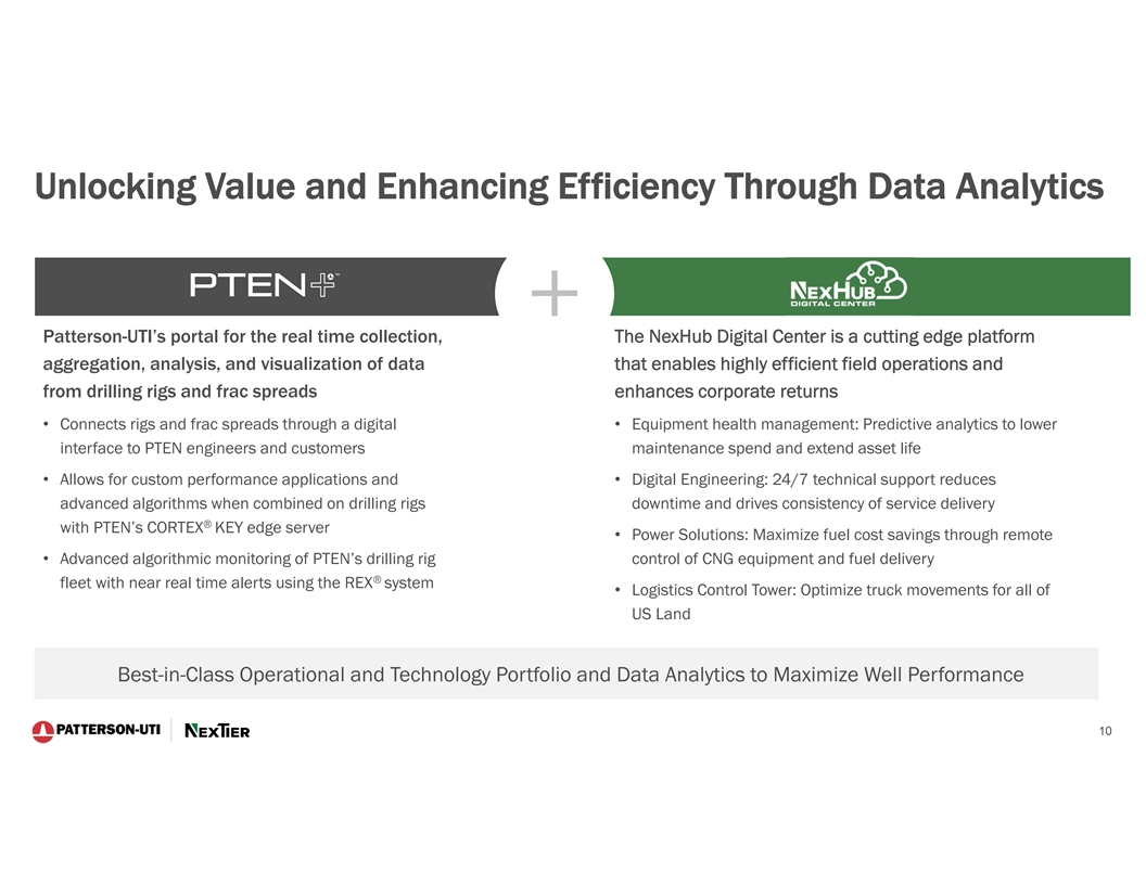 Operations Across the Most Active U.S. Basins 172 3.3 Million Super-Spec Drilling Rigs Hydraulic Horsepower Leading Provider Nearly 2/3 Drilling & Completions Services Dual Fuel Capable Frac Fleets Using Low Carbon Fuel Sources Colombia PTEN Drilling PTEN Drilling and Pressure Pumping NexTier 9
