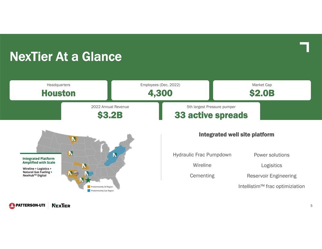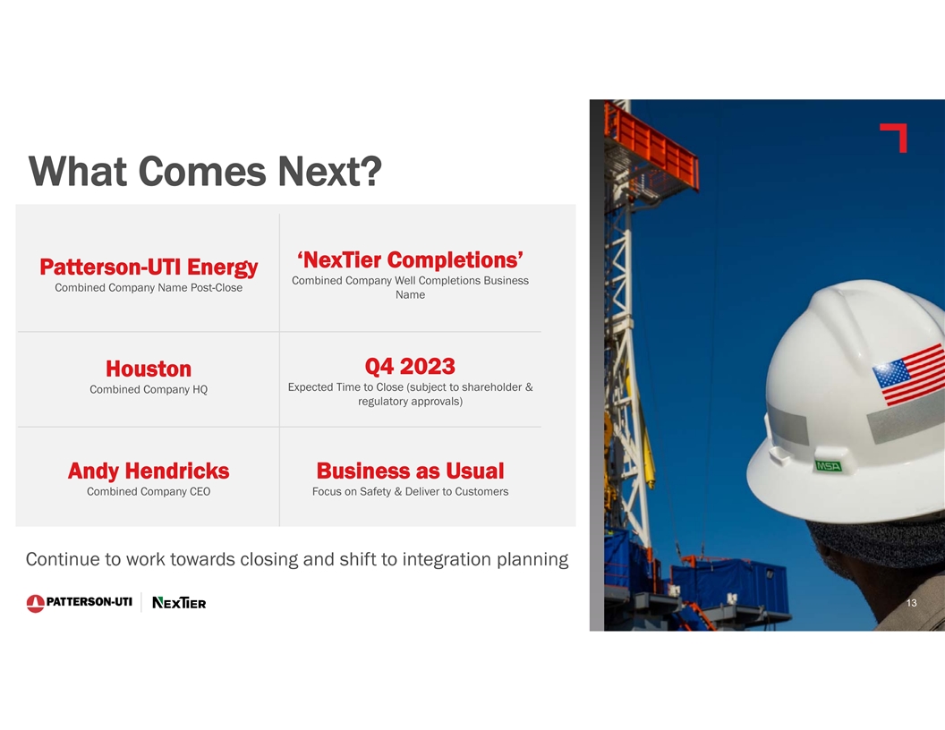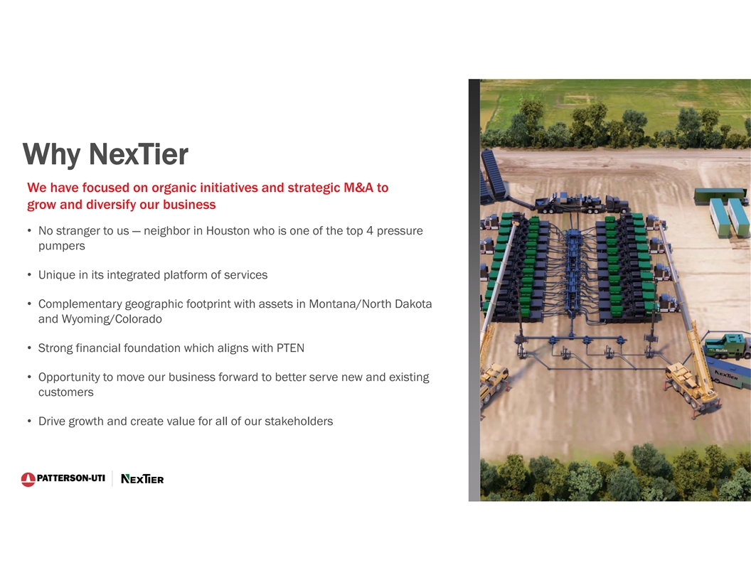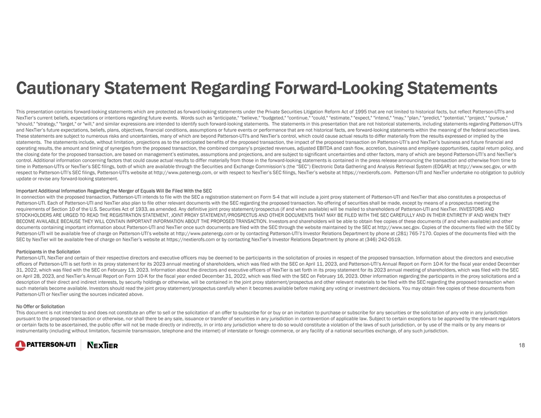 Cautionary Statement Regarding Forward-Looking Statements This presentation contains forward-looking statements which are protected as forward-looking statements under the Private Securities Litigation Reform Act of 1995 that are not limited to historical facts, but reflect Patterson-UTI's and NexTier’s current beliefs, expectations or intentions regarding future events. Words such as anticipate, believe, budgeted, continue, could, estimate, expect, intend, may, plan, predict, potential, project, pursue, should, strategy, target, or will, and similar expressions are intended to identify such forward-looking statements. The statements in this presentation that are not historical statements, including statements regarding Patterson-UTI's and NexTier’s future expectations, beliefs, plans, objectives, financial conditions, assumptions or future events or performance that are not historical facts, are forward-looking statements within the meaning of the federal securities laws. These statements are subject to numerous risks and uncertainties, many of which are beyond Patterson-UTI's and NexTier’s control, which could cause actual results to differ materially from the results expressed or implied by the statements. The statements include, without limitation, projections as to the anticipated benefits of the proposed transaction, the impact of the proposed transaction on Patterson-UTI’s and NexTier’s business and future financial and operating results, the amount and timing of synergies from the proposed transaction, the combined company’s projected revenues, adjusted EBITDA and cash flow, accretion, business and employee opportunities, capital return policy, and the closing date for the proposed transaction, are based on management’s estimates, assumptions and projections, and are subject to significant uncertainties and other factors, many of which are beyond Patterson-UTI’s and NexTier’s control. Additional information concerning factors that could cause actual results to differ materially from those in the forward-looking statements is contained in the press release announcing the transaction and otherwise from time to time in Patterson-UTI's or NexTier’s SEC filings, both of which are available through the Securities and Exchange Commission’s (the “SEC”) Electronic Data Gathering and Analysis Retrieval System (EDGAR) at http://www.sec.gov, or with respect to Patterson-UTI’s SEC filings, Patterson-UTI's website at http://www.patenergy.com, or with respect to NexTier’s SEC filings, NexTier’s website at https://nextierofs.com. Patterson-UTI and NexTier undertake no obligation to publicly update or revise any forward-looking statement. Important Additional Information Regarding the Merger of Equals Will Be Filed With the SEC In connection with the proposed transaction, Patterson-UTI intends to file with the SEC a registration statement on Form S-4 that will include a joint proxy statement of Patterson-UTI and NexTier that also constitutes a prospectus of Patterson-UTI. Each of Patterson-UTI and NexTier also plan to file other relevant documents with the SEC regarding the proposed transaction. No offering of securities shall be made, except by means of a prospectus meeting the requirements of Section 10 of the U.S. Securities Act of 1933, as amended. Any definitive joint proxy statement/prospectus (if and when available) will be mailed to shareholders of Patterson-UTI and NexTier. INVESTORS AND STOCKHOLDERS ARE URGED TO READ THE REGISTRATION STATEMENT, JOINT PROXY STATEMENT/PROSPECTUS AND OTHER DOCUMENTS THAT MAY BE FILED WITH THE SEC CAREFULLY AND IN THEIR ENTIRETY IF AND WHEN THEY BECOME AVAILABLE BECAUSE THEY WILL CONTAIN IMPORTANT INFORMATION ABOUT THE PROPOSED TRANSACTION. Investors and shareholders will be able to obtain free copies of these documents (if and when available) and other documents containing important information about Patterson-UTI and NexTier once such documents are filed with the SEC through the website maintained by the SEC at http://www.sec.gov. Copies of the documents filed with the SEC by Patterson-UTI will be available free of charge on Patterson-UTI’s website at http://www.patenergy.com or by contacting Patterson-UTI’s Investor Relations Department by phone at (281) 765-7170. Copies of the documents filed with the SEC by NexTier will be available free of charge on NexTier’s website at https://nextierofs.com or by contacting NexTier’s Investor Relations Department by phone at (346) 242-0519. Participants in the Solicitation Patterson-UTI, NexTier and certain of their respective directors and executive officers may be deemed to be participants in the solicitation of proxies in respect of the proposed transaction. Information about the directors and executive officers of Patterson-UTI is set forth in its proxy statement for its 2023 annual meeting of shareholders, which was filed with the SEC on April 11, 2023, and Patterson-UTI’s Annual Report on Form 10-K for the fiscal year ended December 31, 2022, which was filed with the SEC on February 13, 2023. Information about the directors and executive officers of NexTier is set forth in its proxy statement for its 2023 annual meeting of shareholders, which was filed with the SEC on April 28, 2023, and NexTier’s Annual Report on Form 10-K for the fiscal year ended December 31, 2022, which was filed with the SEC on February 16, 2023. Other information regarding the participants in the proxy solicitations and a description of their direct and indirect interests, by security holdings or otherwise, will be contained in the joint proxy statement/prospectus and other relevant materials to be filed with the SEC regarding the proposed transaction when such materials become available. Investors should read the joint proxy statement/prospectus carefully when it becomes available before making any voting or investment decisions. You may obtain free copies of these documents from Patterson-UTI