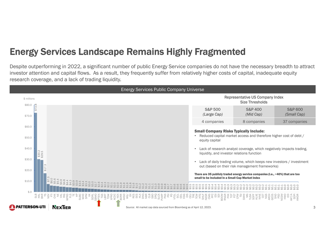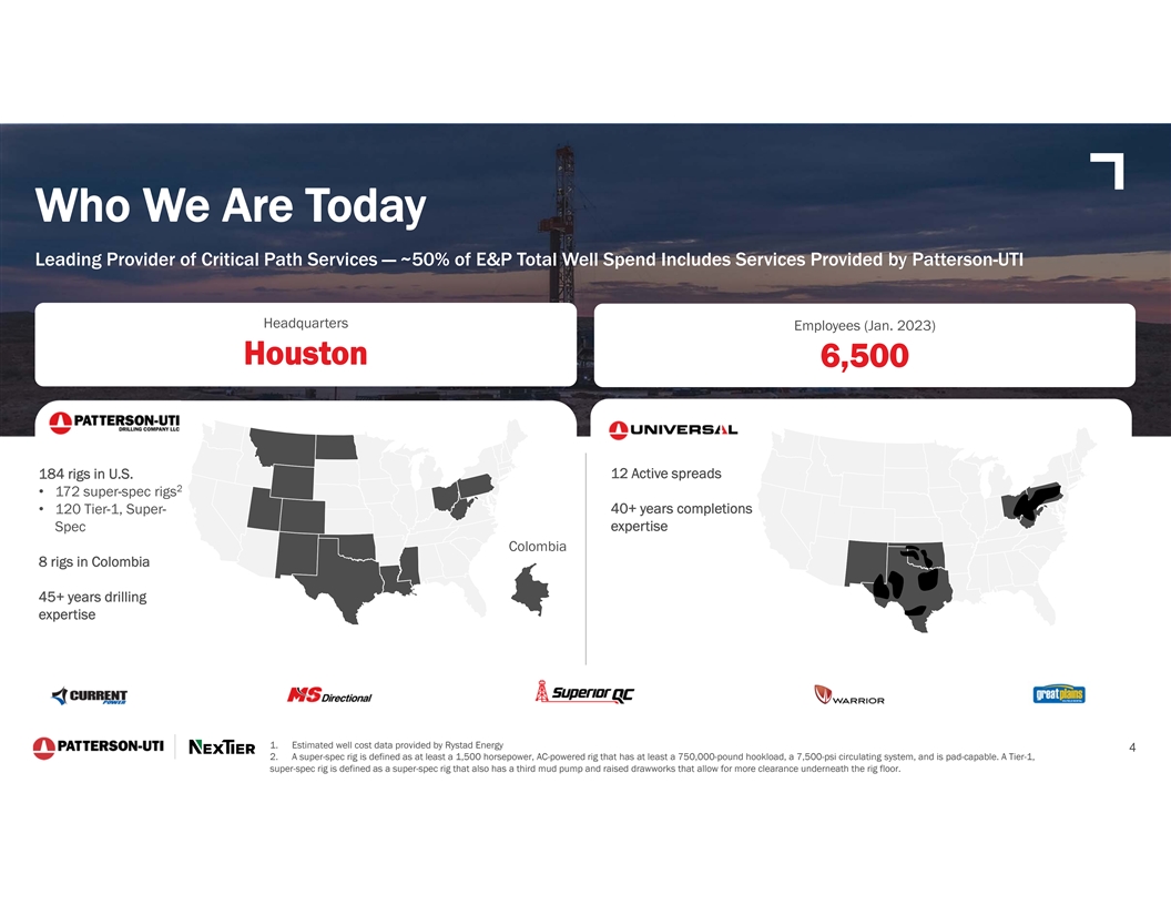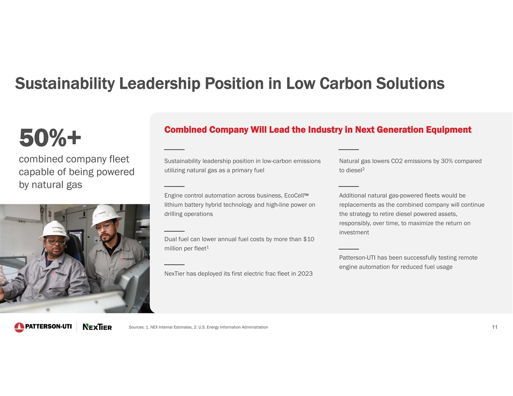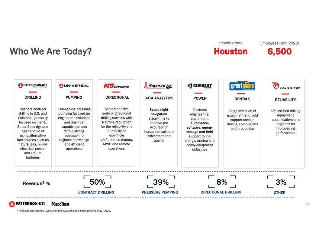 Cautionary Statement Regarding Forward-Looking Statements This presentation contains forward-looking statements which are protected as forward-looking statements under the Private Securities Litigation Reform Act of 1995 that are not limited to historical facts, but reflect Patterson-UTI's and NexTier’s current beliefs, expectations or intentions regarding future events. Words such as anticipate, believe, budgeted, continue, could, estimate, expect, intend, may, plan, predict, potential, project, pursue, should, strategy, target, or will, and similar expressions are intended to identify such forward-looking statements. The statements in this presentation that are not historical statements, including statements regarding Patterson-UTI's and NexTier’s future expectations, beliefs, plans, objectives, financial conditions, assumptions or future events or performance that are not historical facts, are forward-looking statements within the meaning of the federal securities laws. These statements are subject to numerous risks and uncertainties, many of which are beyond Patterson-UTI's and NexTier’s control, which could cause actual results to differ materially from the results expressed or implied by the statements. The statements include, without limitation, projections as to the anticipated benefits of the proposed transaction, the impact of the proposed transaction on Patterson-UTI’s and NexTier’s business and future financial and operating results, the amount and timing of synergies from the proposed transaction, the combined company’s projected revenues, adjusted EBITDA and cash flow, accretion, business and employee opportunities, capital return policy, and the closing date for the proposed transaction, are based on management’s estimates, assumptions and projections, and are subject to significant uncertainties and other factors, many of which are beyond Patterson-UTI’s and NexTier’s control. Additional information concerning factors that could cause actual results to differ materially from those in the forward-looking statements is contained in the press release announcing the transaction and otherwise from time to time in Patterson-UTI's or NexTier’s SEC filings, both of which are available through the Securities and Exchange Commission’s (the “SEC”) Electronic Data Gathering and Analysis Retrieval System (EDGAR) at http://www.sec.gov, or with respect to Patterson-UTI’s SEC filings, Patterson-UTI's website at http://www.patenergy.com, or with respect to NexTier’s SEC filings, NexTier’s website at https://nextierofs.com. Patterson-UTI and NexTier undertake no obligation to publicly update or revise any forward-looking statement. Important Additional Information Regarding the Merger of Equals Will Be Filed With the SEC In connection with the proposed transaction, Patterson-UTI intends to file with the SEC a registration statement on Form S-4 that will include a joint proxy statement of Patterson-UTI and NexTier that also constitutes a prospectus of Patterson-UTI. Each of Patterson-UTI and NexTier also plan to file other relevant documents with the SEC regarding the proposed transaction. No offering of securities shall be made, except by means of a prospectus meeting the requirements of Section 10 of the U.S. Securities Act of 1933, as amended. Any definitive joint proxy statement/prospectus (if and when available) will be mailed to shareholders of Patterson-UTI and NexTier. INVESTORS AND STOCKHOLDERS ARE URGED TO READ THE REGISTRATION STATEMENT, JOINT PROXY STATEMENT/PROSPECTUS AND OTHER DOCUMENTS THAT MAY BE FILED WITH THE SEC CAREFULLY AND IN THEIR ENTIRETY IF AND WHEN THEY BECOME AVAILABLE BECAUSE THEY WILL CONTAIN IMPORTANT INFORMATION ABOUT THE PROPOSED TRANSACTION. Investors and shareholders will be able to obtain free copies of these documents (if and when available) and other documents containing important information about Patterson-UTI and NexTier once such documents are filed with the SEC through the website maintained by the SEC at http://www.sec.gov. Copies of the documents filed with the SEC by Patterson-UTI will be available free of charge on Patterson-UTI’s website at http://www.patenergy.com or by contacting Patterson-UTI’s Investor Relations Department by phone at (281) 765-7170. Copies of the documents filed with the SEC by NexTier will be available free of charge on NexTier’s website at https://nextierofs.com or by contacting NexTier’s Investor Relations Department by phone at (346) 242-0519. Participants in the Solicitation Patterson-UTI, NexTier and certain of their respective directors and executive officers may be deemed to be participants in the solicitation of proxies in respect of the proposed transaction. Information about the directors and executive officers of Patterson-UTI is set forth in its proxy statement for its 2023 annual meeting of shareholders, which was filed with the SEC on April 11, 2023, and Patterson-UTI’s Annual Report on Form 10-K for the fiscal year ended December 31, 2022, which was filed with the SEC on February 13, 2023. Information about the directors and executive officers of NexTier is set forth in its proxy statement for its 2023 annual meeting of shareholders, which was filed with the SEC on April 28, 2023, and NexTier’s Annual Report on Form 10-K for the fiscal year ended December 31, 2022, which was filed with the SEC on February 16, 2023. Other information regarding the participants in the proxy solicitations and a description of their direct and indirect interests, by security holdings or otherwise, will be contained in the joint proxy statement/prospectus and other relevant materials to be filed with the SEC regarding the proposed transaction when such materials become available. Investors should read the joint proxy statement/prospectus carefully when it becomes available before making any voting or investment decisions. You may obtain free copies of these documents from Patterson-UTI