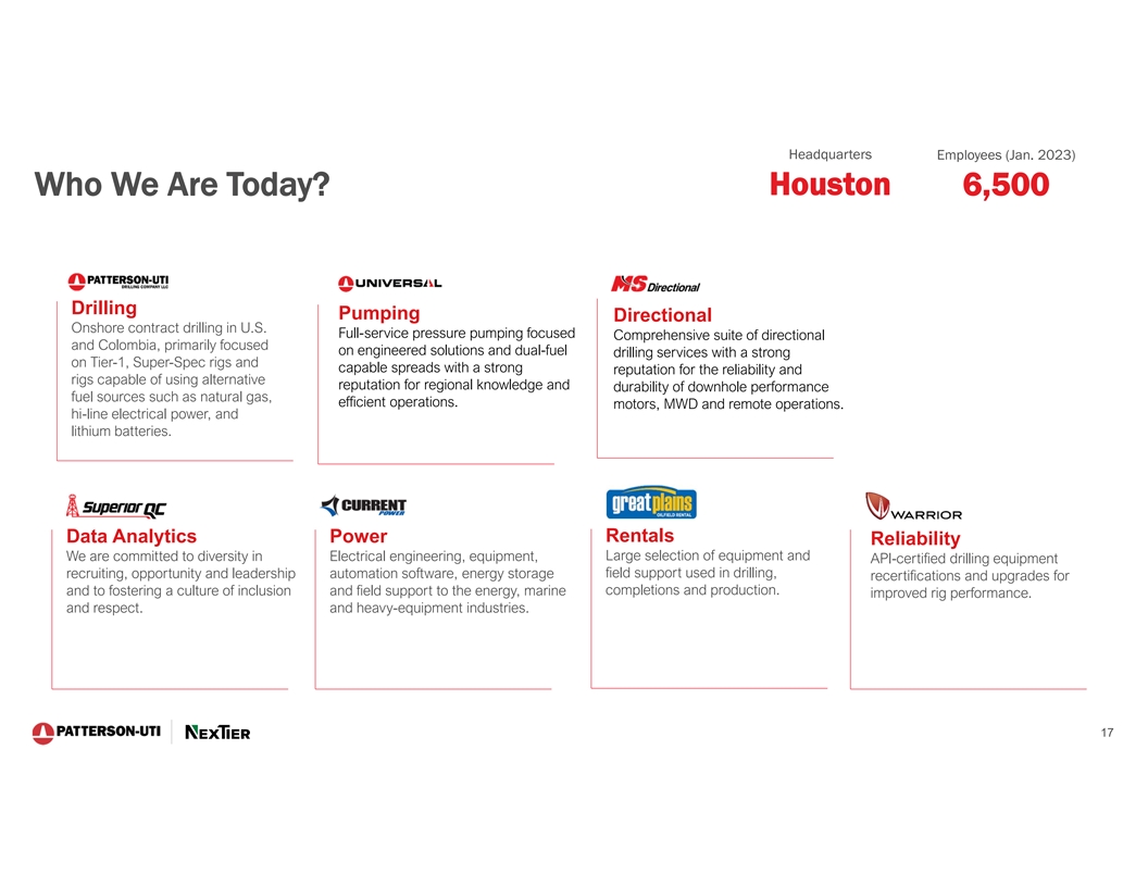 Headquarters Employees (Jan. 2023) Who We Are Today? Houston 6,500 DRILLING PUMPING DIRECTIONAL DATA ANALYTICS POWER RENTALS RELIABILITY Onshore contract Full-service pressure Comprehensive Space flight Electrical Large selection of API-certified drilling drilling in U.S. and pumping focused on suite of directional navigation engineering, equipment and field equipment Colombia, primarily engineered solutions drilling services with algorithms to equipment, recertifications and support used in focused on Tier-1, and dual-fuel a strong reputation improve the automation upgrades for drilling, completions Super-Spec rigs and capable spreads for the reliability and accuracy of software, energy improved rig and production rigs capable of with a strong durability of horizontal wellbore storage and field performance downhole using alternative reputation for placement and support to the performance motors, fuel sources such as regional knowledge quality energy, marine and MWD and remote natural gas, hi-line and efficient heavy-equipment electrical power, operations operations industries and lithium batteries 1 50% 39% 8% 3% Revenue % CONTRACT DRILLING PRESSURE PUMPING DIRECTIONAL DRILLING OTHER 16 2 16 1 Patterson-UTI reported revenue for the twelve months ended December 31, 2022.