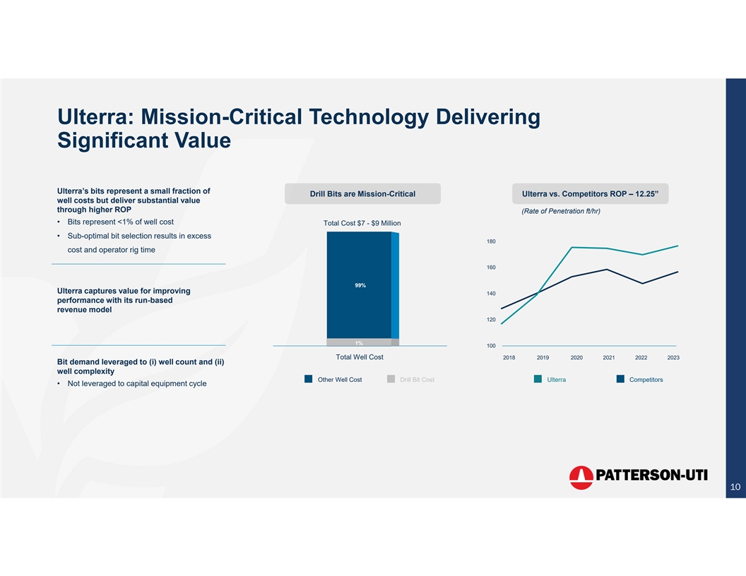 Comprehensive PDC Drill Bit Offering Ulterra innovates and introduces key drill bit technologies that solve customer problems Ulterra designs, manufactures, sells and rents matrix and steel-bodied PDC drill bits. Bits are typically rented, except in select international markets where they are sold. Capability to manufacture both bit body types is necessary to be a meaningful player. (1) PDC = ~90% of Total Drill Bit Market (2) Matrix PDC Drill Bits Steel PDC Drill Bits • Stronger steel body permits more hydraulically • Superior abrasion and corrosion resistance aggressive designs • Used in the most demanding applications • ~47% of Ulterra PDC revenue globally • Provides maximum design flexibility • Average 4.9 runs/bit • ~53% of Ulterra PDC revenue globally • Average 7.5 runs/bit ® ® ® ® Split Blade RipSaw WaveCut CounterForce Cuttings Evacuation Transitional Drilling Mechanical Efficiency Lateral Vibration 2013 2018 2019 2022 (1) Oil and gas drill bit market only. Source: Company provided information (2) Matrix is tungsten carbide 9