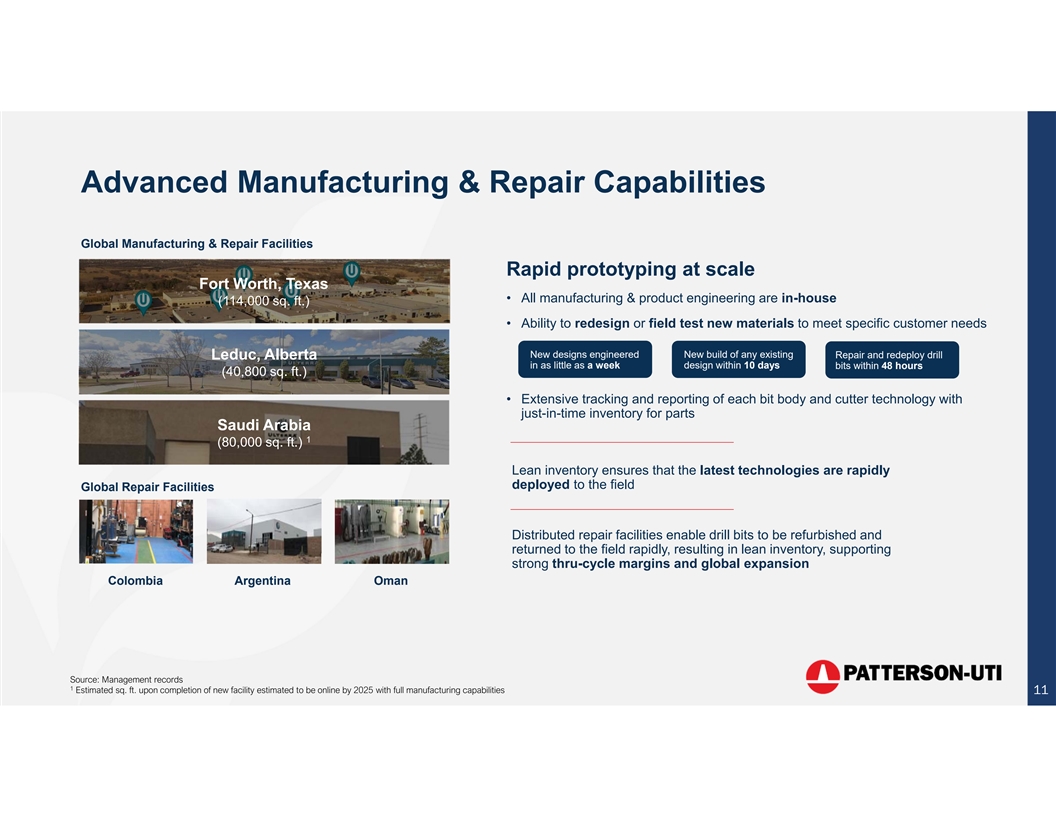 Ulterra: Mission-Critical Technology Delivering Significant Value Ulterra’s bits represent a small fraction of Drill Bits are Mission-Critical Ulterra vs. Competitors ROP – 12.25” well costs but deliver substantial value through higher ROP (Rate of Penetration ft/hr) • Bits represent <1% of well cost Total Cost $7 - $9 Million • Sub-optimal bit selection results in excess 180 cost and operator rig time 160 99% Ulterra captures value for improving 140 performance with its run-based revenue model 120 1% 100 Total Well Cost 2018 2019 2020 2021 2022 2023 Bit demand leveraged to (i) well count and (ii) well complexity Other Well Cost Drill Bit Cost Ulterra Competitors • Not leveraged to capital equipment cycle 10