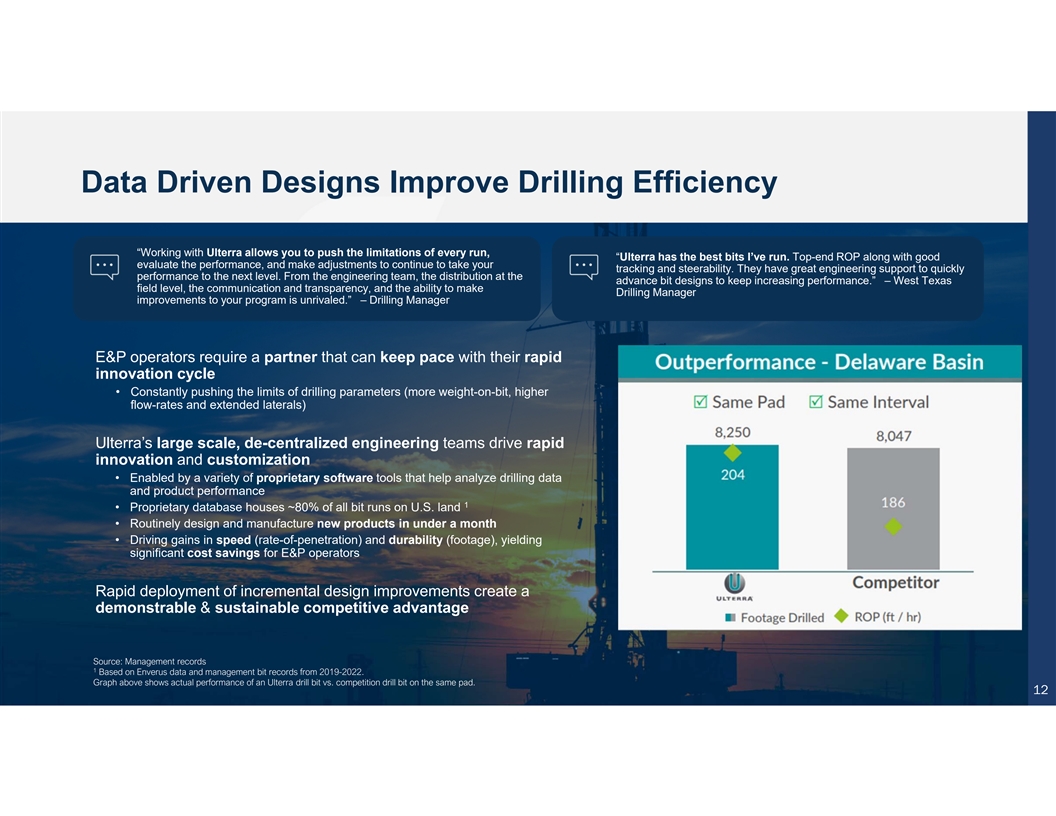 Data Driven Designs Improve Drilling Efficiency “Working with Ulterra allows you to push the limitations of every run, “Ulterra has the best bits I’ve run. Top-end ROP along with good evaluate the performance, and make adjustments to continue to take your tracking and steerability. They have great engineering support to quickly performance to the next level. From the engineering team, the distribution at the advance bit designs to keep increasing performance.” – West Texas field level, the communication and transparency, and the ability to make Drilling Manager improvements to your program is unrivaled.” – Drilling Manager E&P operators require a partner that can keep pace with their rapid innovation cycle • Constantly pushing the limits of drilling parameters (more weight-on-bit, higher flow-rates and extended laterals) Ulterra’s large scale, de-centralized engineering teams drive rapid innovation and customization • Enabled by a variety of proprietary software tools that help analyze drilling data and product performance 1 • Proprietary database houses ~80% of all bit runs on U.S. land • Routinely design and manufacture new products in under a month • Driving gains in speed (rate-of-penetration) and durability (footage), yielding significant cost savings for E&P operators Rapid deployment of incremental design improvements create a demonstrable & sustainable competitive advantage Source: Management records 1 Based on Enverus data and management bit records from 2019-2022. Graph above shows actual performance of an Ulterra drill bit vs. competition drill bit on the same pad. 12