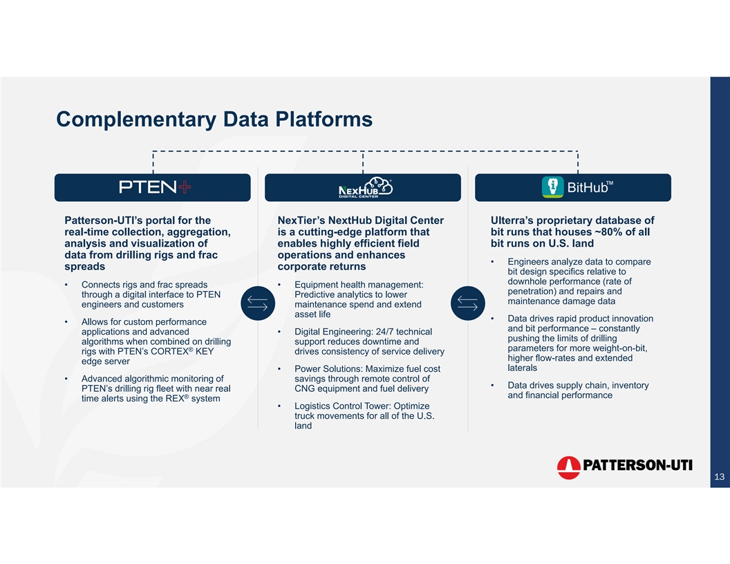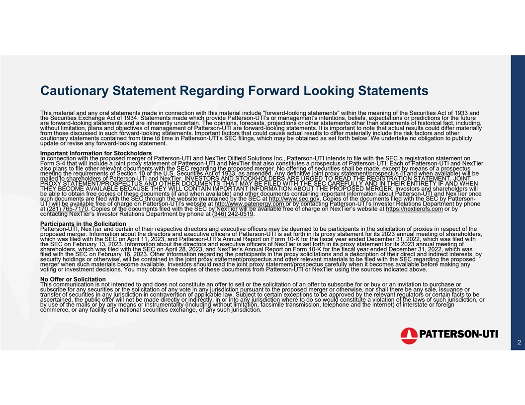 Cautionary Statement Regarding Forward Looking Statements This material and any oral statements made in connection with this material include forward-looking statements within the meaning of the Securities Act of 1933 and the Securities Exchange Act of 1934. Statements made which provide Patterson-UTI’s or management’s intentions, beliefs, expectations or predictions for the future are forward-looking statements and are inherently uncertain. The opinions, forecasts, projections or other statements other than statements of historical fact, including, without limitation, plans and objectives of management of Patterson-UTI are forward-looking statements. It is important to note that actual results could differ materially from those discussed in such forward-looking statements. Important factors that could cause actual results to differ materially include the risk factors and other cautionary statements contained from time to time in Patterson-UTI’s SEC filings, which may be obtained as set forth below. We undertake no obligation to publicly update or revise any forward-looking statement. Important Information for Stockholders In connection with the proposed merger of Patterson-UTI and NexTier Oilfield Solutions Inc., Patterson-UTI intends to file with the SEC a registration statement on Form S-4 that will include a joint proxy statement of Patterson-UTI and NexTier that also constitutes a prospectus of Patterson-UTI. Each of Patterson-UTI and NexTier also plans to file other relevant documents with the SEC regarding the proposed merger. No offering of securities shall be made, except by means of a prospectus meeting the requirements of Section 10 of the U.S. Securities Act of 1933, as amended. Any definitive joint proxy statement/prospectus (if and when available) will be mailed to shareholders of Patterson-UTI and NexTier. INVESTORS AND STOCKHOLDERS ARE URGED TO READ THE REGISTRATION STATEMENT, JOINT PROXY STATEMENT/PROSPECTUS AND OTHER DOCUMENTS THAT MAY BE FILED WITH THE SEC CAREFULLY AND IN THEIR ENTIRETY IF AND WHEN THEY BECOME AVAILABLE BECAUSE THEY WILL CONTAIN IMPORTANT INFORMATION ABOUT THE PROPOSED MERGER. Investors and shareholders will be able to obtain free copies of these documents (if and when available) and other documents containing important information about Patterson-UTI and NexTier once such documents are filed with the SEC through the website maintained by the SEC at http://www.sec.gov. Copies of the documents filed with the SEC by Patterson- UTI will be available free of charge on Patterson-UTI’s website at http://www.patenergy.com or by contacting Patterson-UTI’s Investor Relations Department by phone at (281) 765-7170. Copies of the documents filed with the SEC by NexTier will be available free of charge on NexTier’s website at https://nextierofs.com or by contacting NexTier’s Investor Relations Department by phone at (346) 242-0519. Participants in the Solicitation Patterson-UTI, NexTier and certain of their respective directors and executive officers may be deemed to be participants in the solicitation of proxies in respect of the proposed merger. Information about the directors and executive officers of Patterson-UTI is set forth in its proxy statement for its 2023 annual meeting of shareholders, which was filed with the SEC on April 11, 2023, and Patterson-UTI’s Annual Report on Form 10-K for the fiscal year ended December 31, 2022, which was filed with the SEC on February 13, 2023. Information about the directors and executive officers of NexTier is set forth in its proxy statement for its 2023 annual meeting of shareholders, which was filed with the SEC on April 28, 2023, and NexTier’s Annual Report on Form 10-K for the fiscal year ended December 31, 2022, which was filed with the SEC on February 16, 2023. Other information regarding the participants in the proxy solicitations and a description of their direct and indirect interests, by security holdings or otherwise, will be contained in the joint proxy statement/prospectus and other relevant materials to be filed with the SEC regarding the proposed merger when such materials become available. Investors should read the joint proxy statement/prospectus carefully when it becomes available before making any voting or investment decisions. You may obtain free copies of these documents from Patterson-UTI or NexTier using the sources indicated above. No Offer or Solicitation This communication is not intended to and does not constitute an offer to sell or the solicitation of an offer to subscribe for or buy or an invitation to purchase or subscribe for any securities or the solicitation of any vote in any jurisdiction pursuant to the proposed merger or otherwise, nor shall there be any sale, issuance or transfer of securities in any jurisdiction in contravention of applicable law. Subject to certain exceptions to be approved by the relevant regulators or certain facts to be ascertained, the public offer will not be made directly or indirectly, in or into any jurisdiction where to do so would constitute a violation of the laws of such jurisdiction, or by use of the mails or by any means or instrumentality (including without limitation, facsimile transmission, telephone and the internet) of interstate or foreign commerce, or any facility of a national securities exchange, of any such jurisdiction. 2