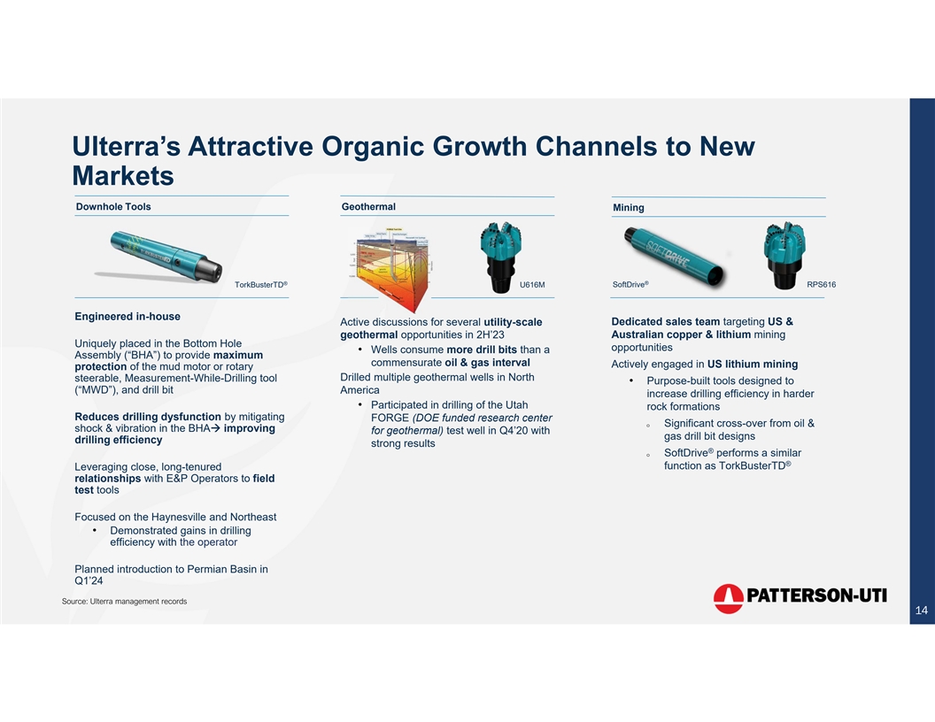Complementary Data Platforms Patterson-UTI’s portal for the NexTier’s NextHub Digital Center Ulterra’s proprietary database of real-time collection, aggregation, is a cutting-edge platform that bit runs that houses ~80% of all analysis and visualization of enables highly efficient field bit runs on U.S. land data from drilling rigs and frac operations and enhances • Engineers analyze data to compare spreads corporate returns bit design specifics relative to downhole performance (rate of • Connects rigs and frac spreads • Equipment health management: penetration) and repairs and through a digital interface to PTEN Predictive analytics to lower maintenance damage data engineers and customers maintenance spend and extend asset life • Data drives rapid product innovation • Allows for custom performance and bit performance – constantly applications and advanced • Digital Engineering: 24/7 technical pushing the limits of drilling algorithms when combined on drilling support reduces downtime and parameters for more weight-on-bit, ® rigs with PTEN’s CORTEX KEY drives consistency of service delivery higher flow-rates and extended edge server laterals • Power Solutions: Maximize fuel cost • Advanced algorithmic monitoring of savings through remote control of • Data drives supply chain, inventory PTEN’s drilling rig fleet with near real CNG equipment and fuel delivery and financial performance ® time alerts using the REX system • Logistics Control Tower: Optimize truck movements for all of the U.S. land 13